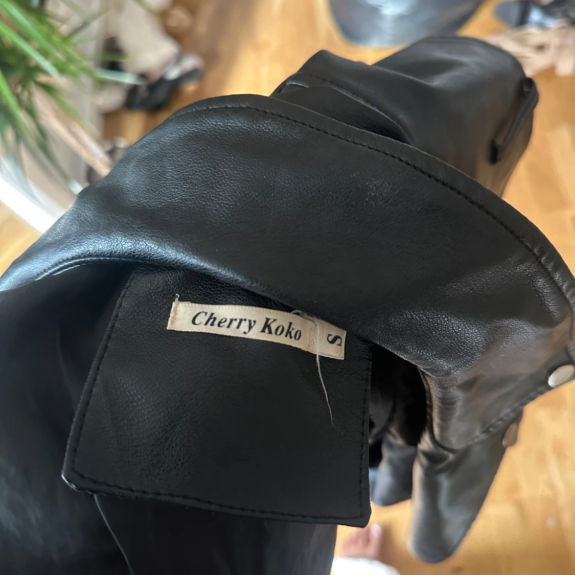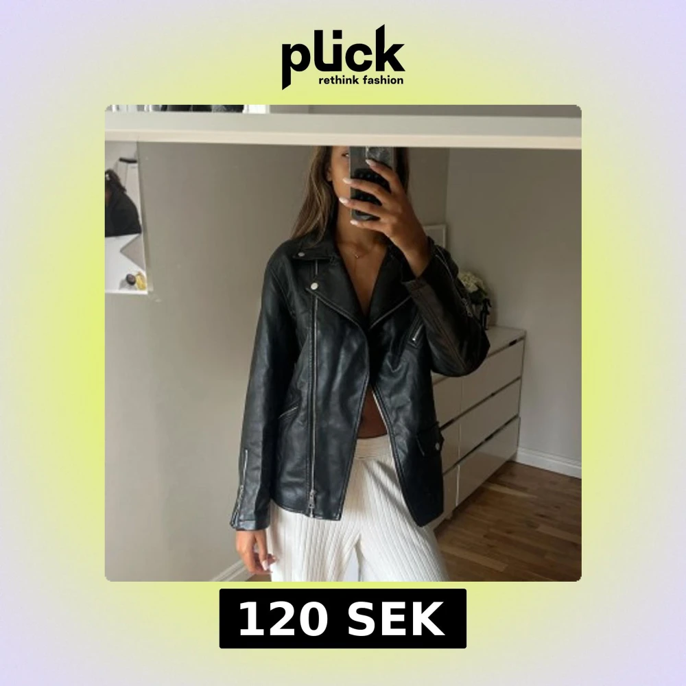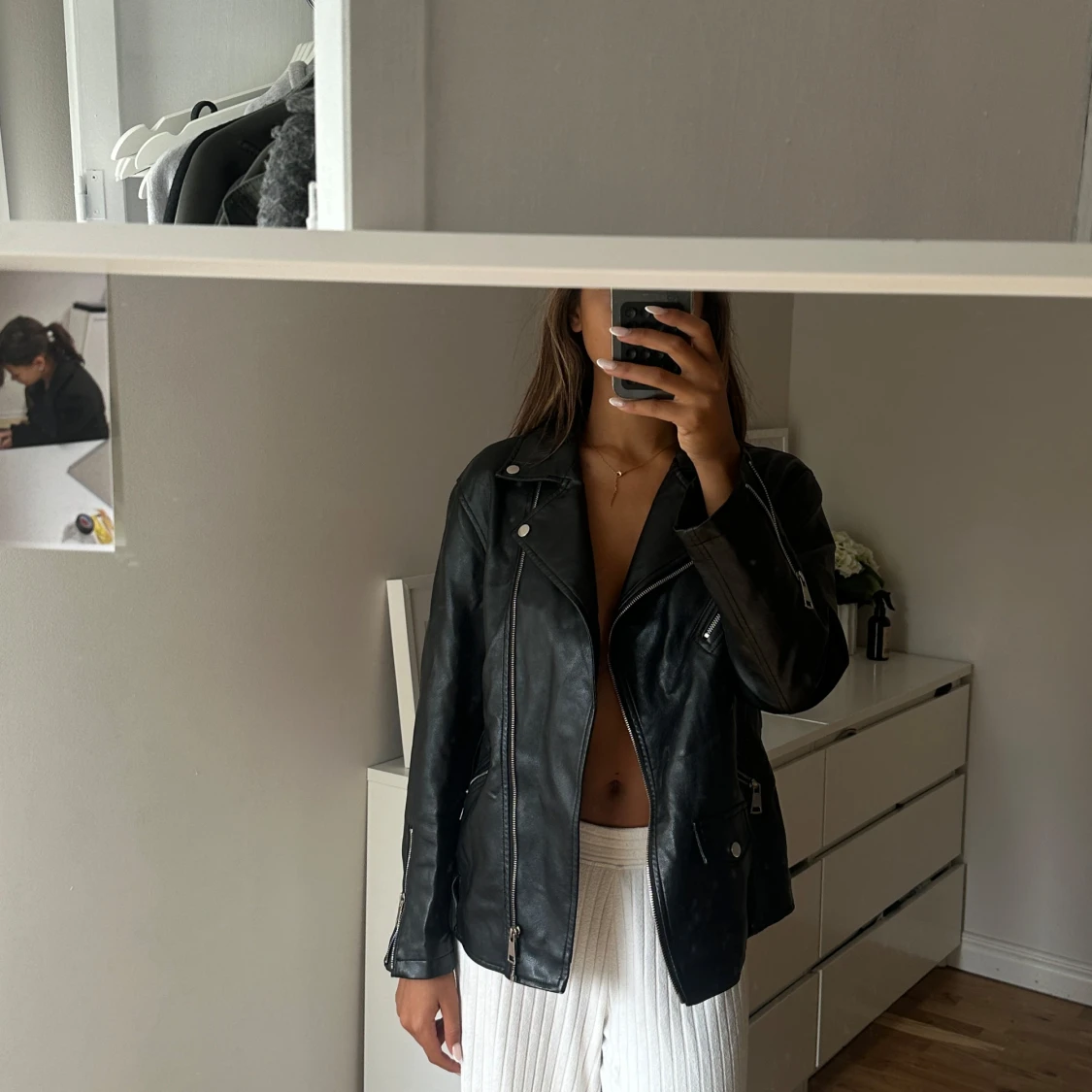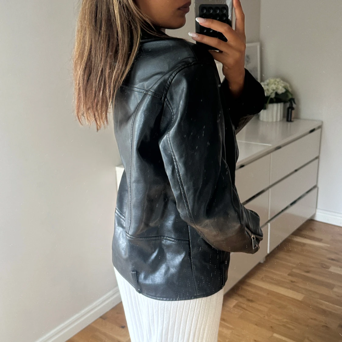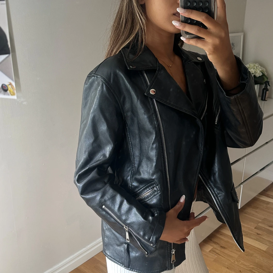 Säljer en svart skinnjacka med cool bikerstil. Jackan har silvriga dragkedjor, snedställd front och klassisk krage med tryckknappar. Långärmad modell med fickor och detaljer vid ärmslut. Perfekt för dig som vill ha en edgy look.
