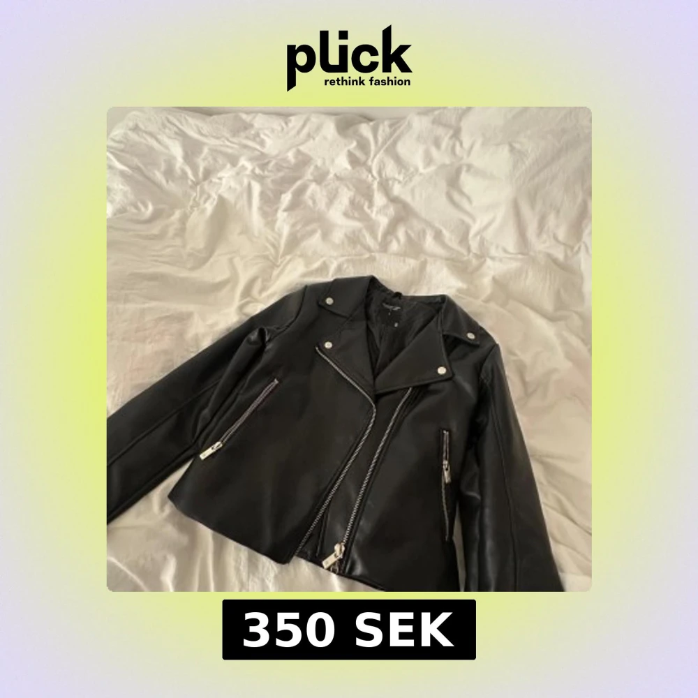 Säljer en svart skinnjacka från Bik Bok med silvriga dragkedjor och knappar. Jackan har klassisk bikerstil med bred krage och två snedställda fickor framtill. Perfekt för en cool och stilren look.