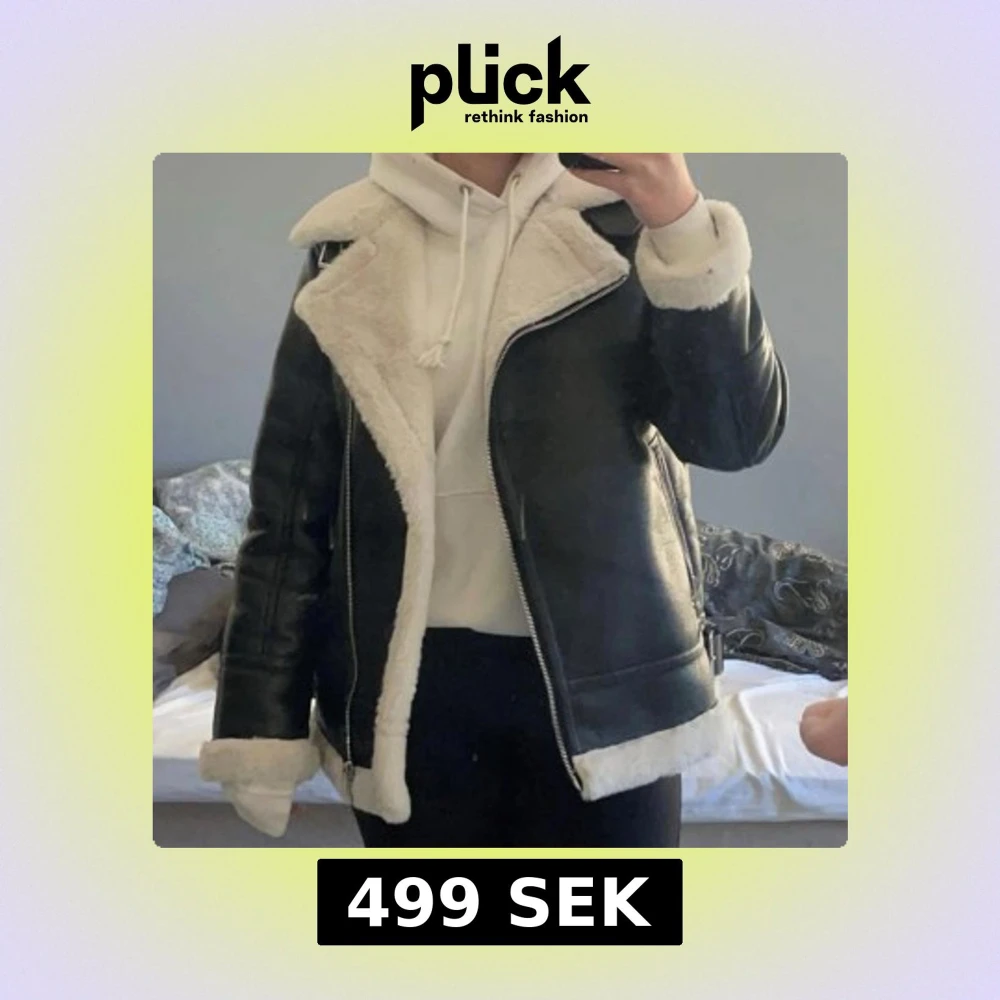Säljer en svart skinnjacka med vitt teddyfoder och dragkedja. Jackan har bred krage, långa ärmar och synliga sömmar. Perfekt för dig som vill ha en cool och varm look till hösten eller vintern.
