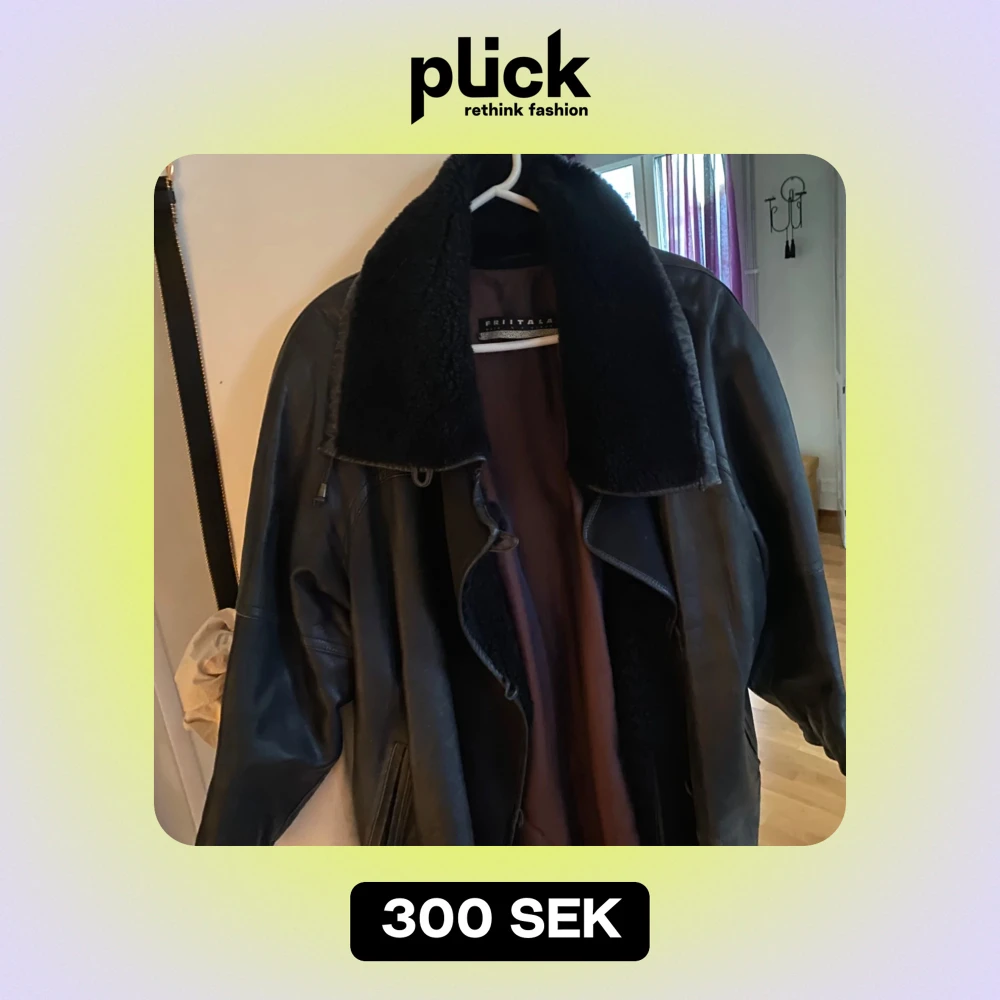 Säljer en snygg svart skinnjacka från Friitala med mjukt pälsfoder. Jackan har en klassisk design med dragkedja och en stor krage i ull. Vintage
