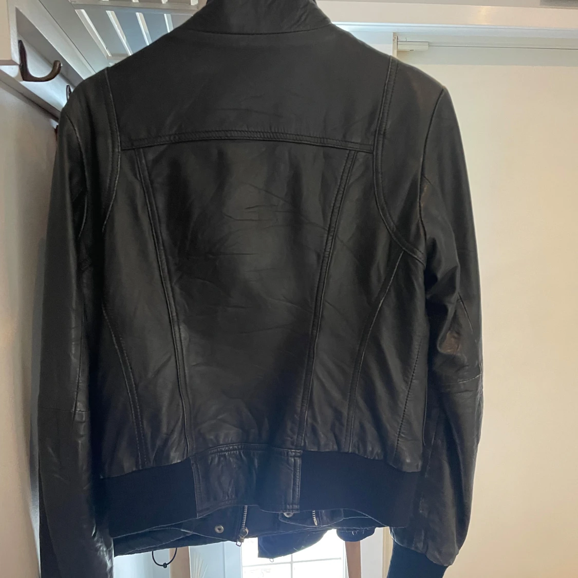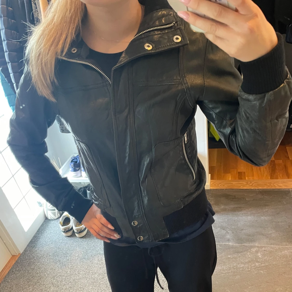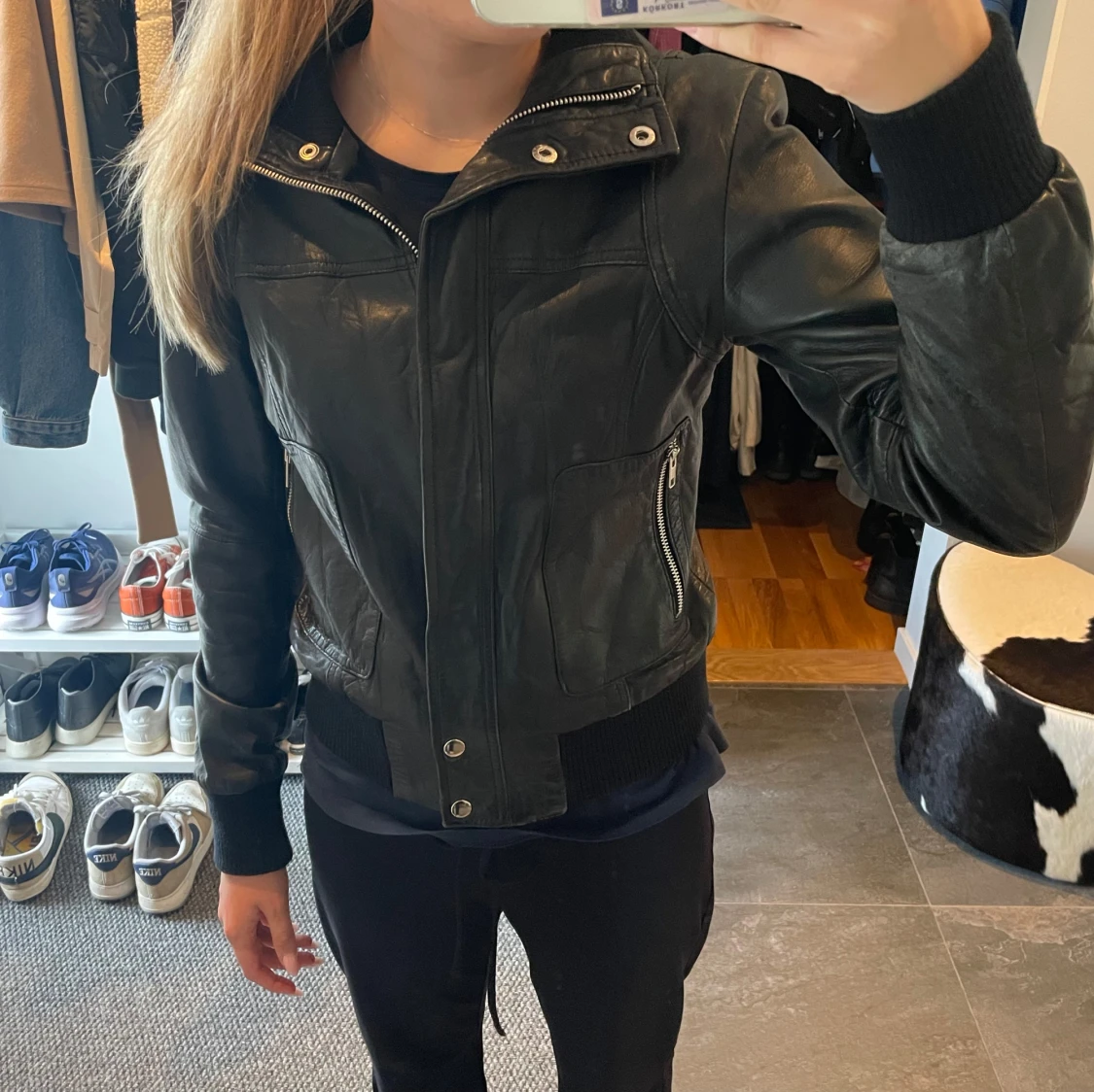 Snygg men sliten skinnjacka. Välanvänd därav sprucket skinn här o där samt är dragkedjan till ena fickan lite trög, annars bra skick. Slim fit med knappar och dragkedja. Säljer då den inte är min stil och inte används. Hör av er för frågor! 💗
