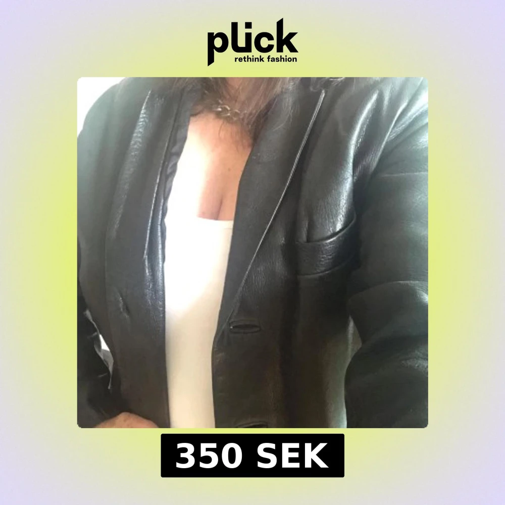 Snygg svart kavaj i äkta skinn med klassisk krage och tre knappar framtill. Flera fickor och stilren passform, perfekt för dig som vill ha en edgy men stilren look. Fodrad insida och lång ärm. Passar till många olika outfits. Modellen är large. Inköpt på loppis i Amsterdam. Fodret kan behöva lite kärlek.