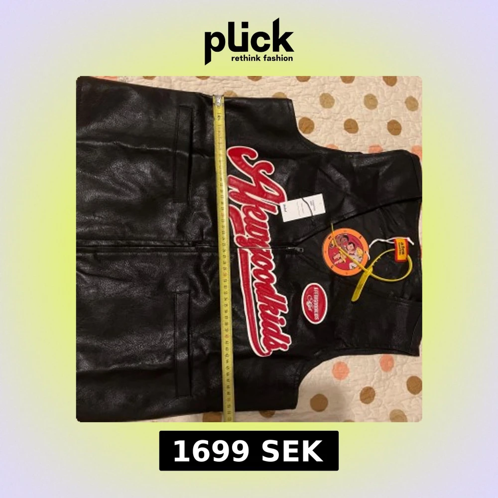 Svart väst i skinn från A Few Good Kids med stor röd broderad logga på framsidan och mindre patch. Västen har dragkedja, två fickor och coolt mönstrat innerfoder med märkets namn. Perfekt för dig som vill sticka ut med streetstyle.