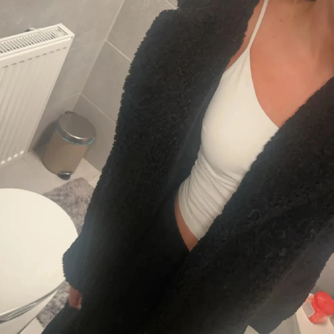 Mysig svart teddyjacka som är perfekt för kyliga dagar. Jackan har en lång och bekväm passform med långa ärmar. Den är gjord av ett mjukt och fluffigt material som håller dig varm och stilren.