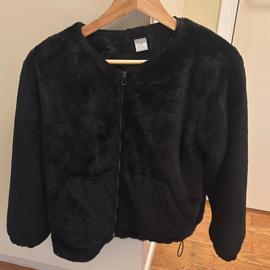 Mysig svart teddyjacka från Lindex med dragkedja framtill och två stora fickor. Jackan har rund halsringning och är helfodrad, perfekt för kyliga dagar. Den har en loose passform och är tillverkad i mjukt syntetmaterial.