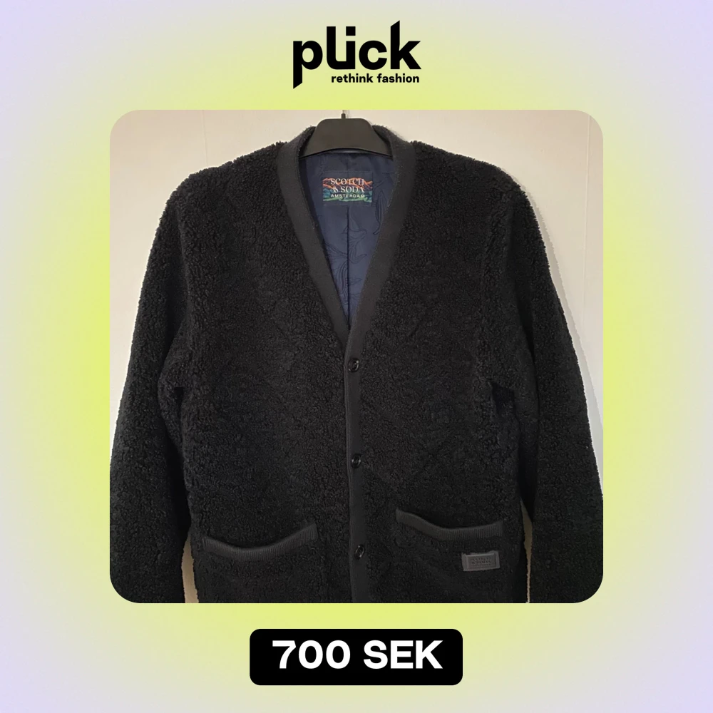 Mysig svart teddyjacka från Scotch & Soda, perfekt för kyliga dagar. Jackan har en v-ringad design med knappar framtill och två praktiska fickor. Den är i mycket bra skick och ger en stilren look. Passar både till vardags och lite finare tillfällen.