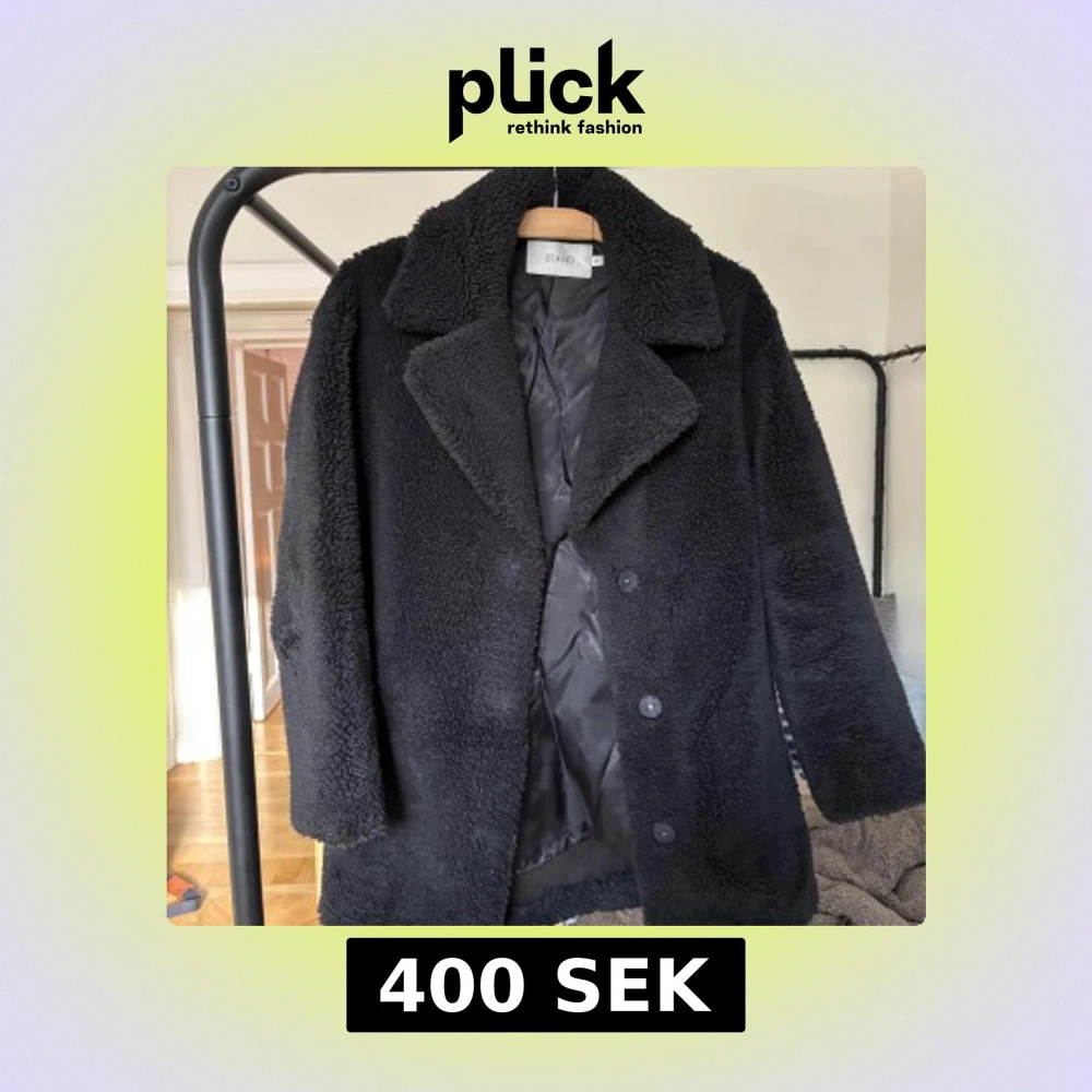 Svart teddyjacka från Stand i storlek 34. Jackan har stora slag, knäppning med knappar och är helfodrad. Ganska oversized och köpt secondhand. Kan mötas i sthlm (klicka INTE köp nu, skriv privat isf!)