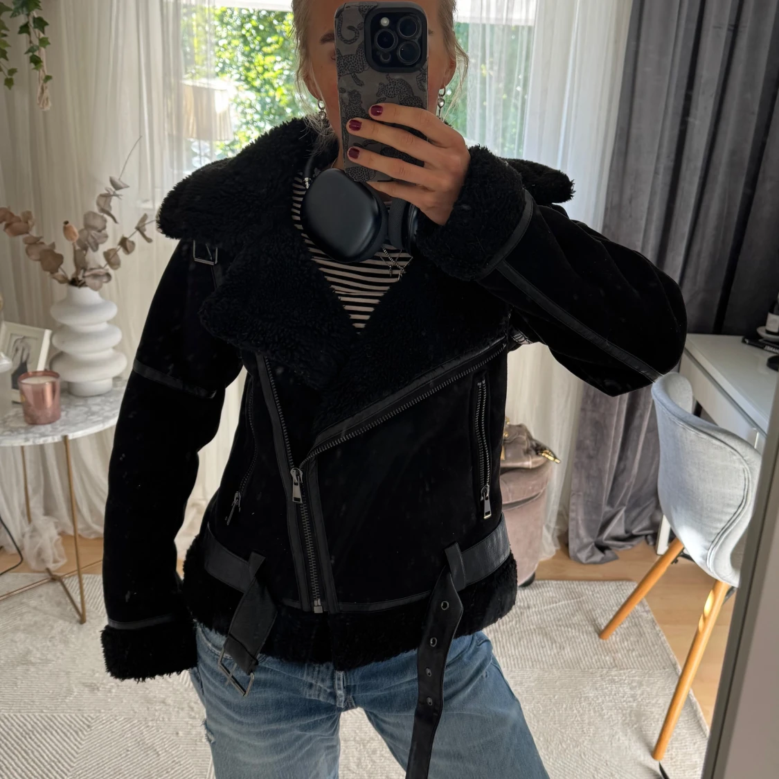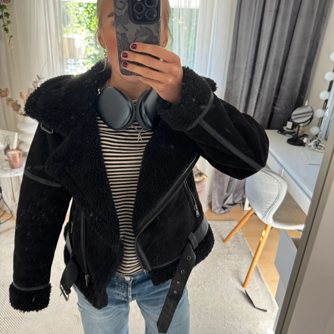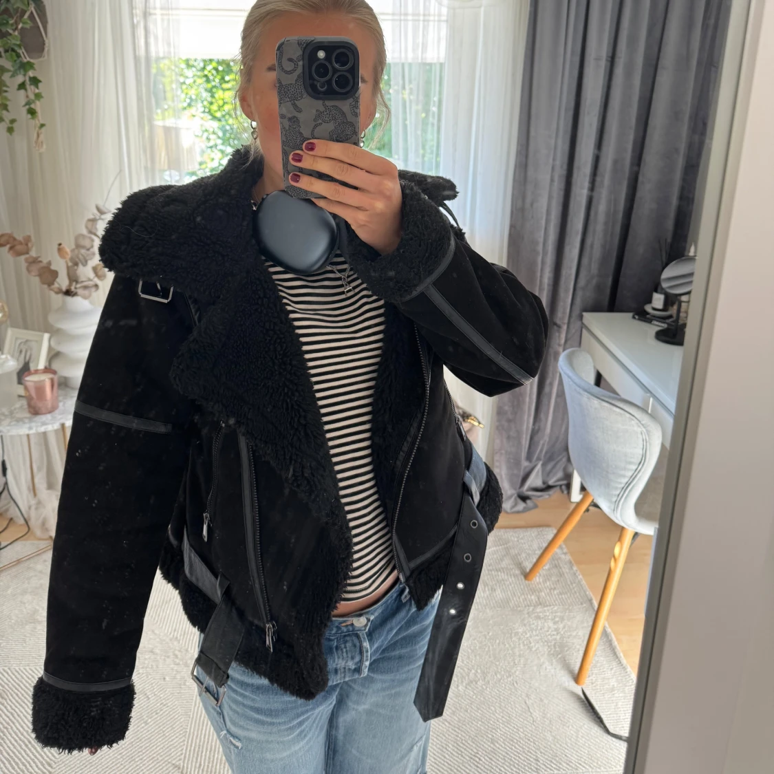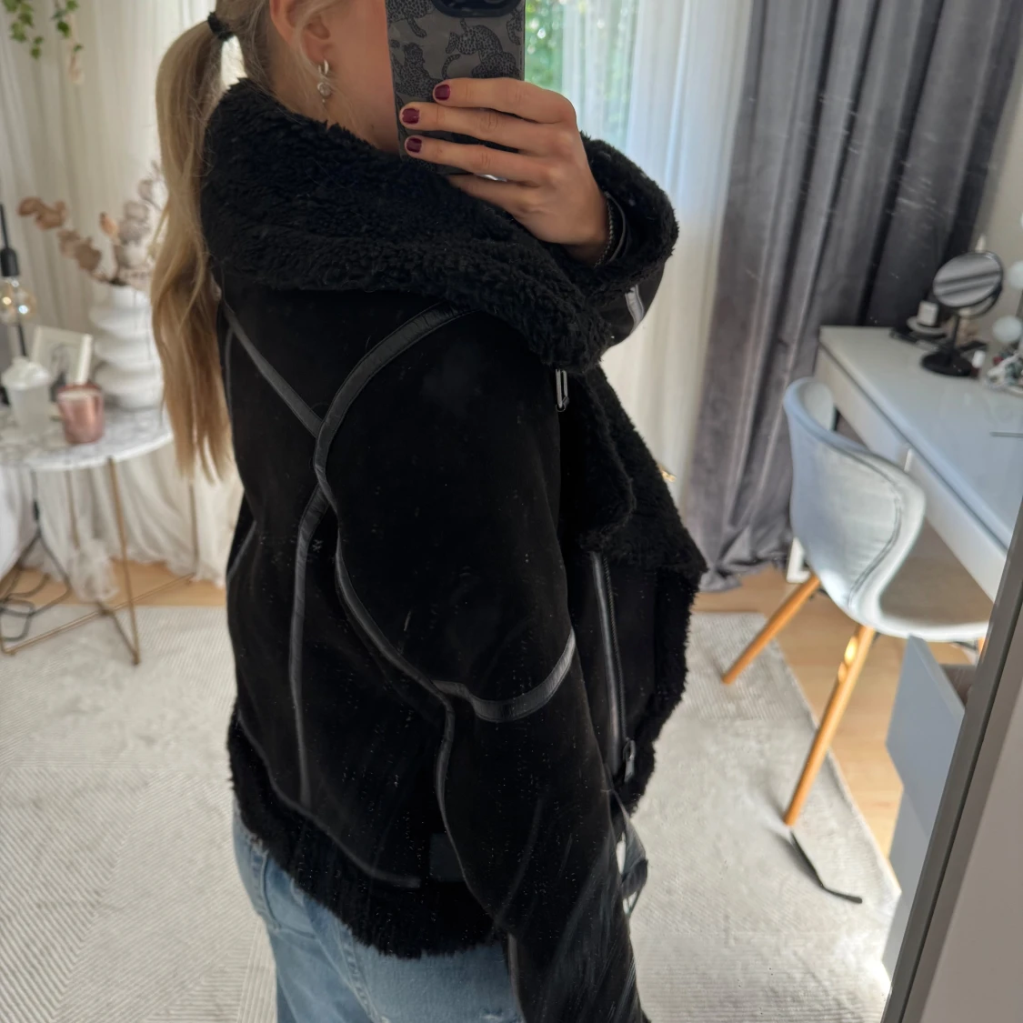 Säljer en svart teddyjacka med bred krage, markerade sömmar och bälte i midjan. Jackan har dragkedjor framtill och på fickorna samt mjukt teddyfoder på insidan och vid ärmsluten. Perfekt för dig som vill ha en cool och mysig look. Passar xs-m