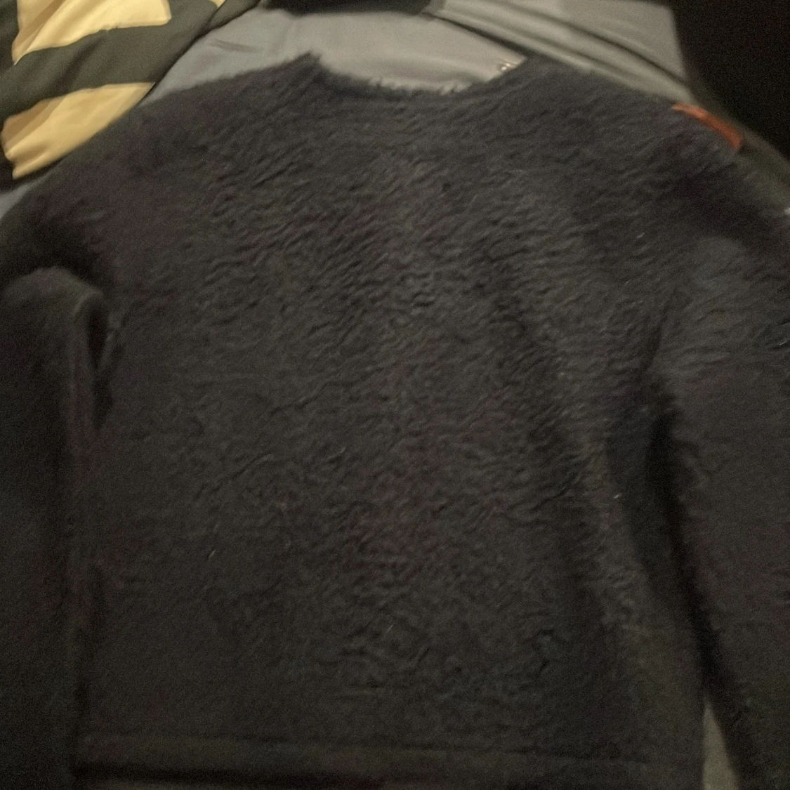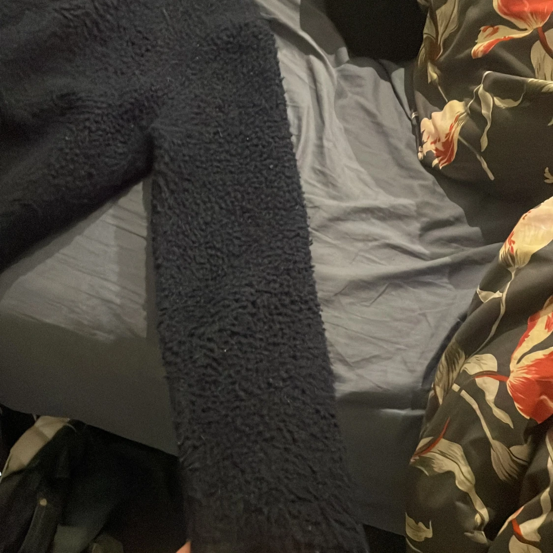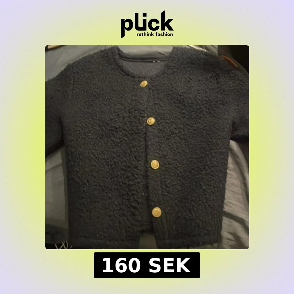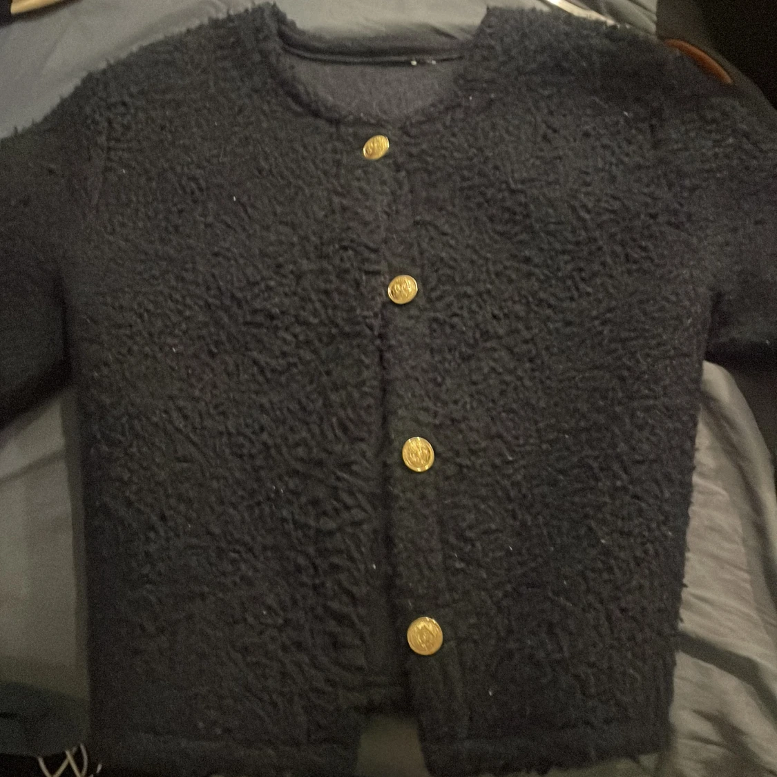 Mysig svart teddyjacka med rund hals och fyra snygga guldknappar framtill. Jackan har långärmade ärmar och en fluffig, strukturerad yta som ger en cool vibe. Perfekt för dig som gillar stilrena och bekväma plagg med lite edge.