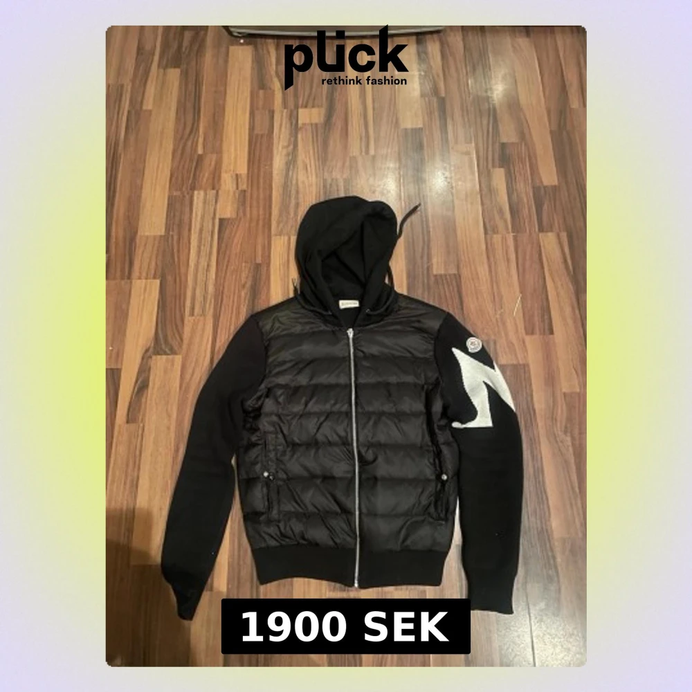 Svart teddyjacka från Moncler med quiltad front, stickade ärmar och stor vit logga på vänster ärm. Jackan har huva med snörning och dragkedja framtill. Perfekt för dig som vill ha en stilren och sportig look.