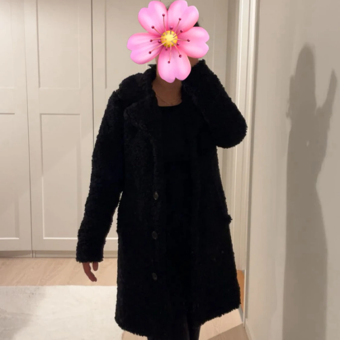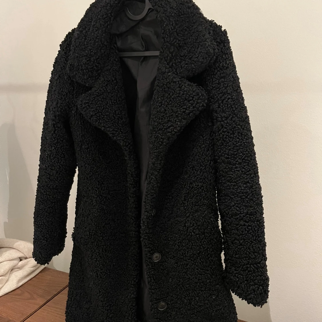 Mysig svart teddyjacka med stora slag och knäppning framtill. Jackan har lång ärm och är tillverkad i ett fluffigt teddy-material som ger en cool och avslappnad vibe. Perfekt för kyliga dagar när du vill vara både varm och snygg. Använd endast ett fåtal gånger
