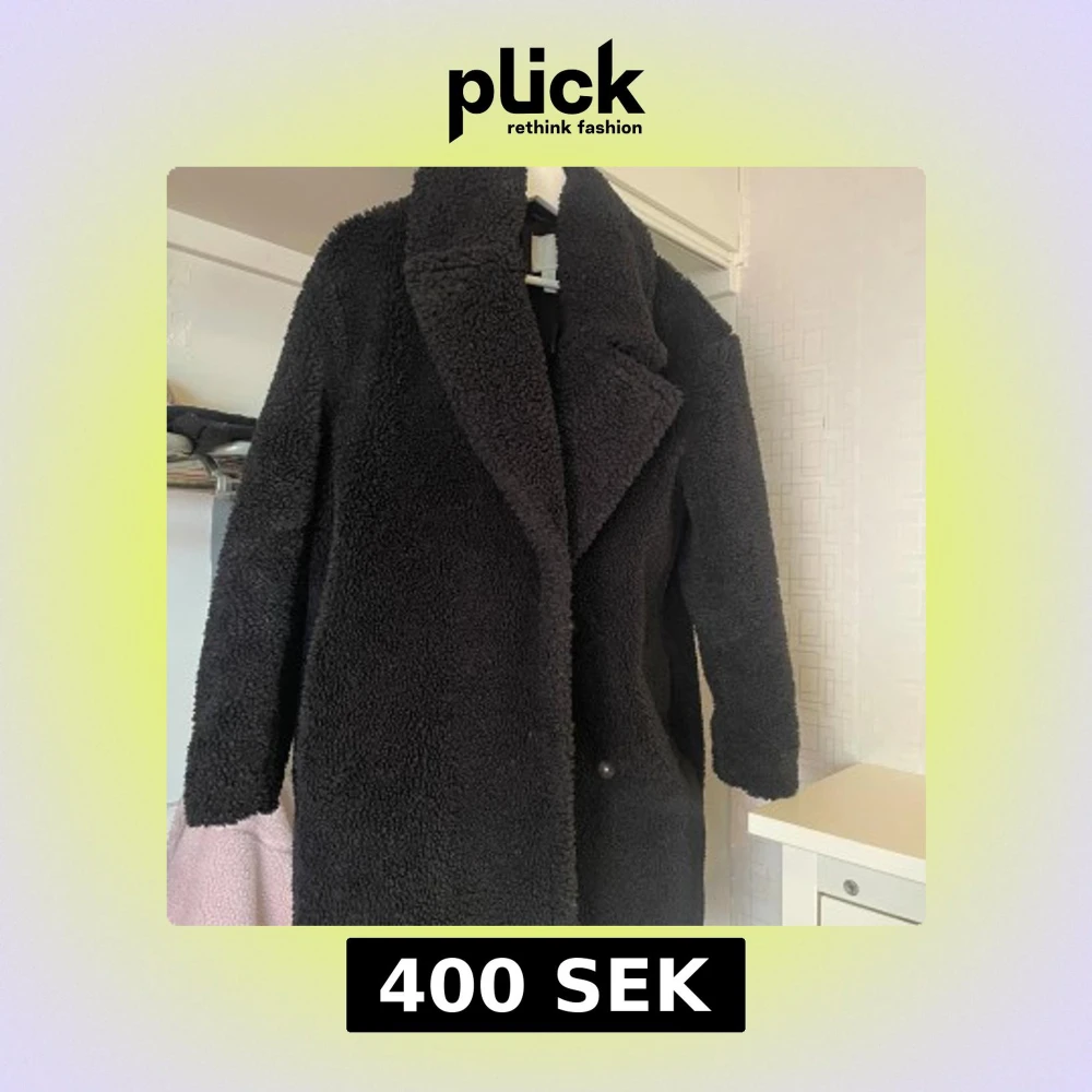 Mysig svart teddyjacka med bred krage och långa ärmar. Jackan har en rak passform och stängs med knappar framtill. Perfekt för kyligare dagar och ger en trendig look.
