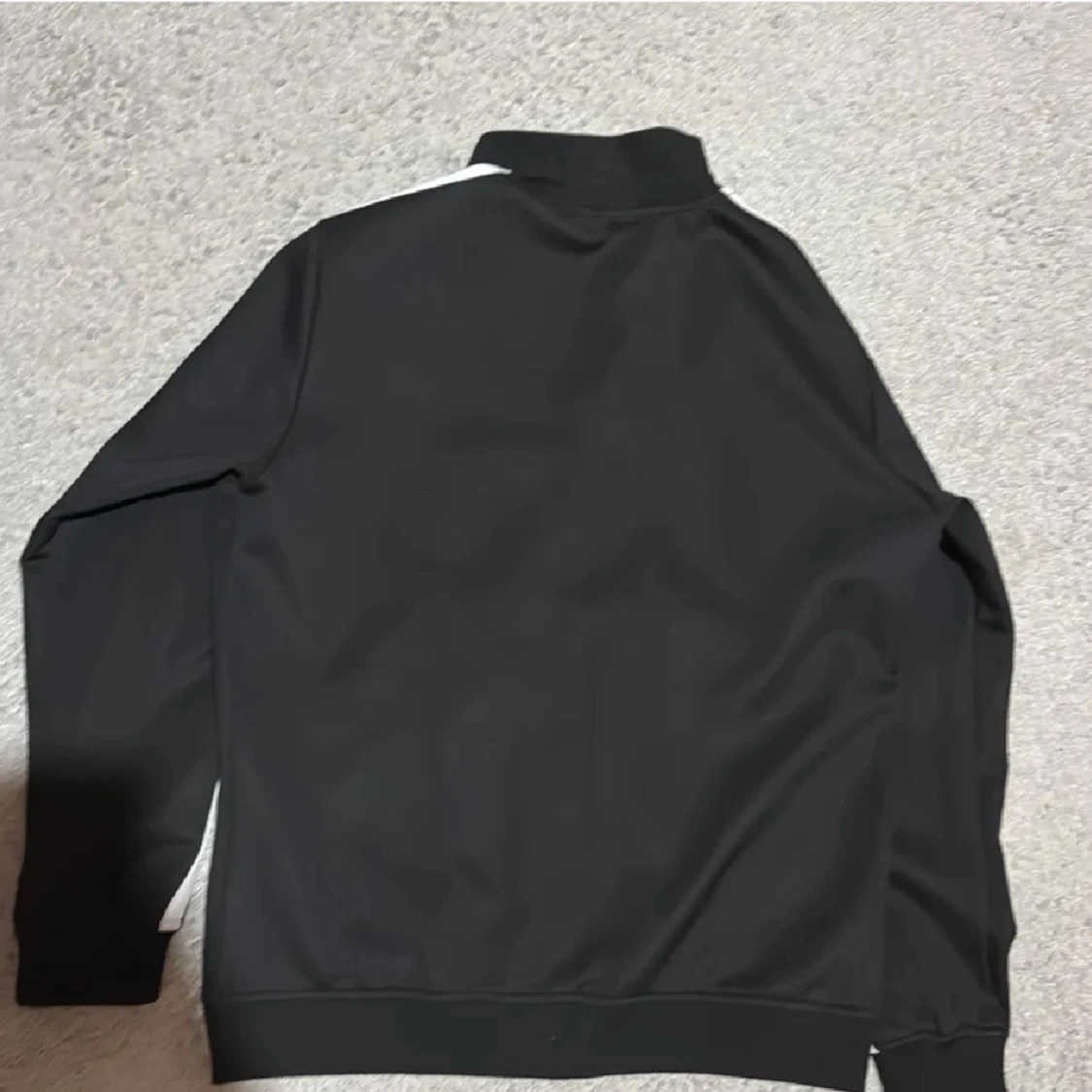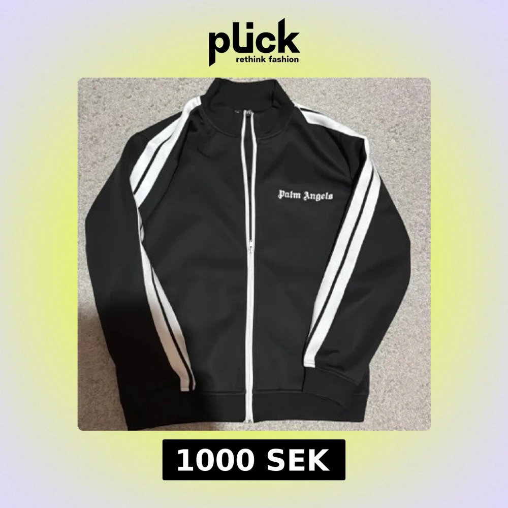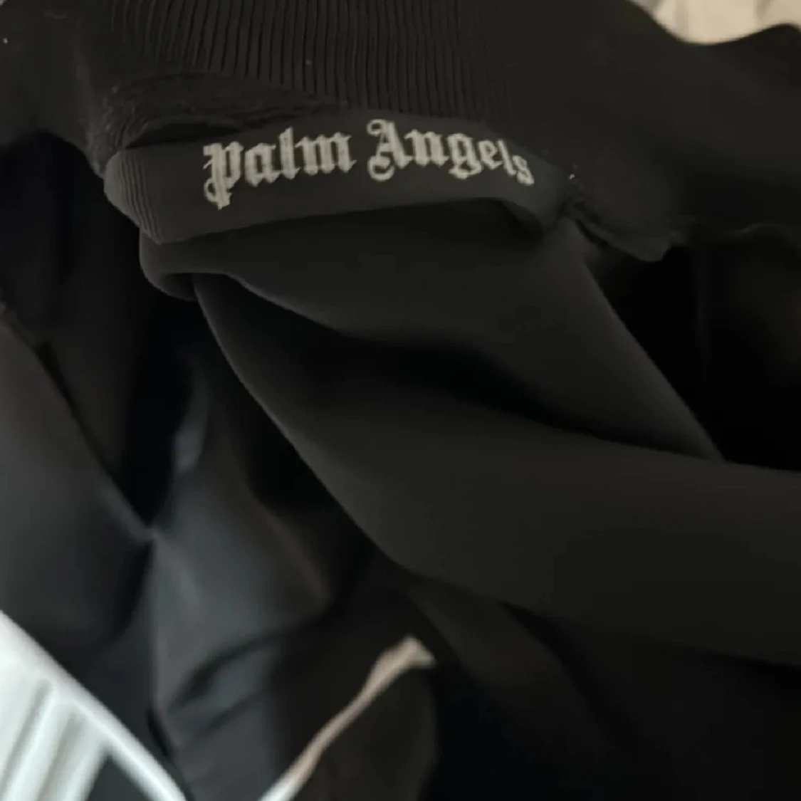 Snygg svart track jacket från Palm Angels med vita ränder längs ärmarna och dragkedja framtill. Jackan har en hög krage och Palm Angels-logga på bröstet. Perfekt för en sportig look.