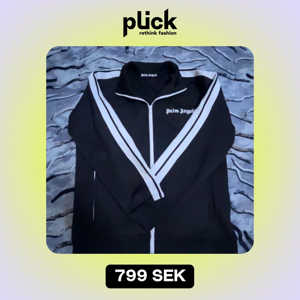 Snygg svart track jacket från Palm Angels med vita ränder längs ärmarna och dragkedja framtill. Jackan har en hög krage och Palm Angels-logga på bröstet. Perfekt för en sportig look.