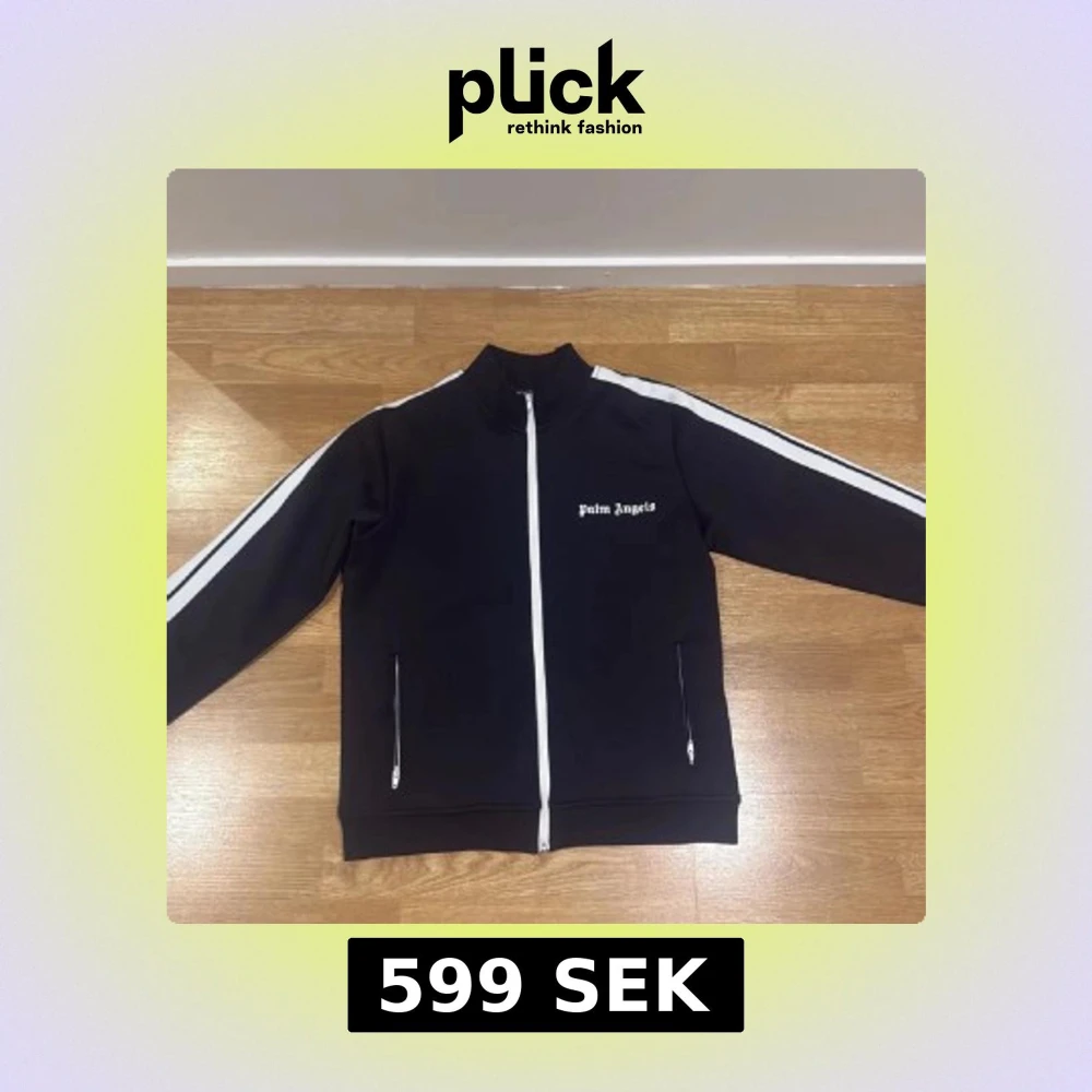 Svart track jacket från Palm Angels med vita ränder längs ärmarna och vit dragkedja framtill. Jackan har ståkrage, två fickor med dragkedja och Palm Angels-logga på bröstet. Snygg och sportig stil, perfekt för streetwear.
