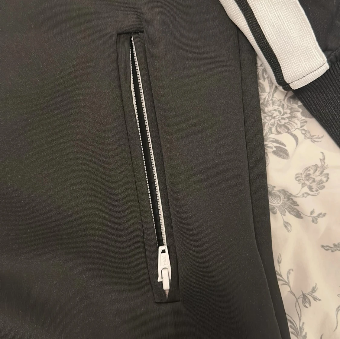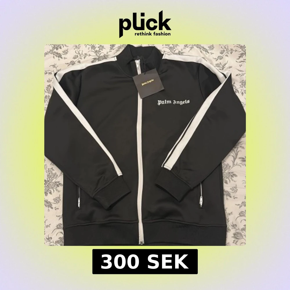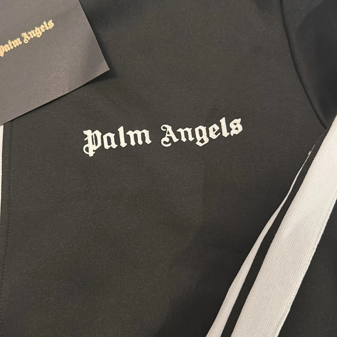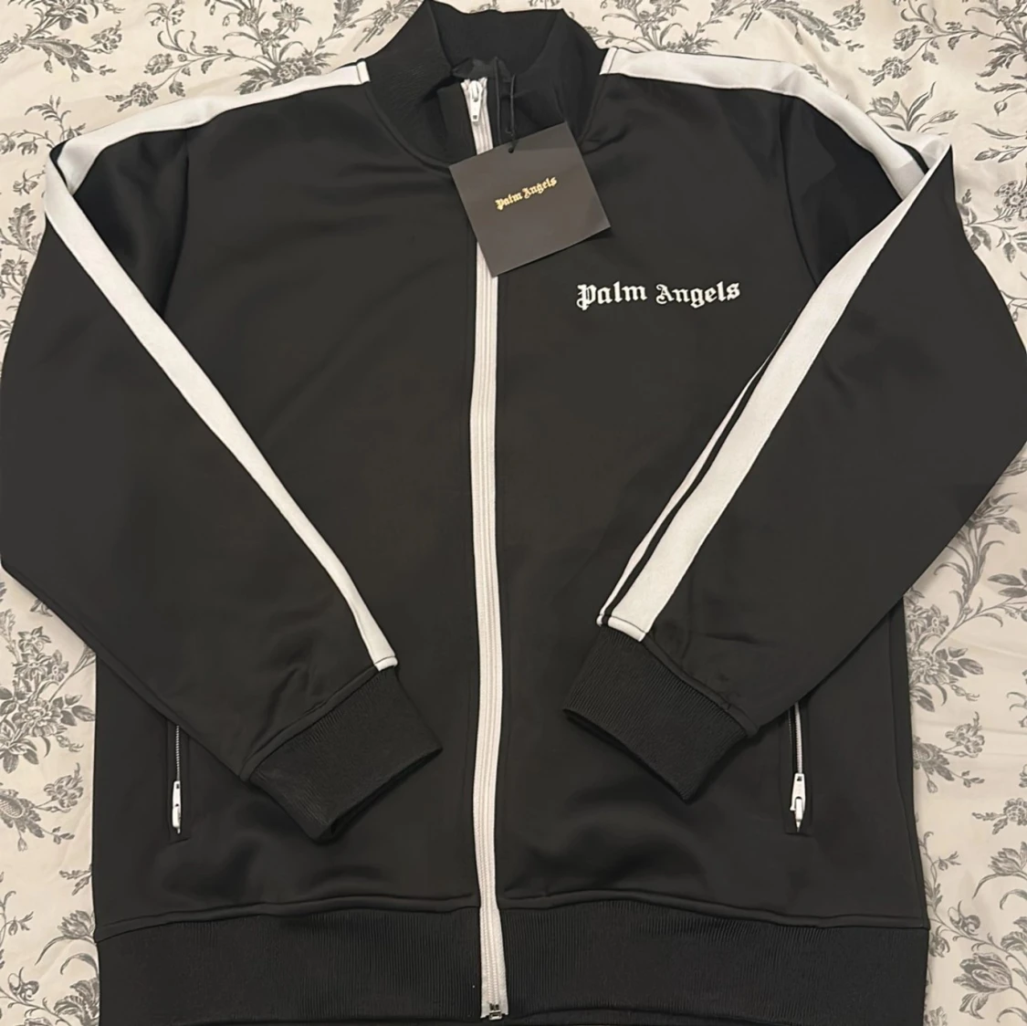 Svart track jacket från Palm Angels med vita ränder längs ärmarna och vit dragkedja. Jackan har ståkrage, ribbade muddar och logotypen tryckt på bröstet. Perfekt för en sportig och trendig look.