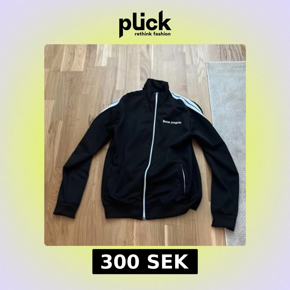 Säljer en svart track jacket från Palm Angels med vit dragkedja och vita ränder längs axlarna. Jackan har hög krage och två fickor framtill. Perfekt för en sportig och trendig look.