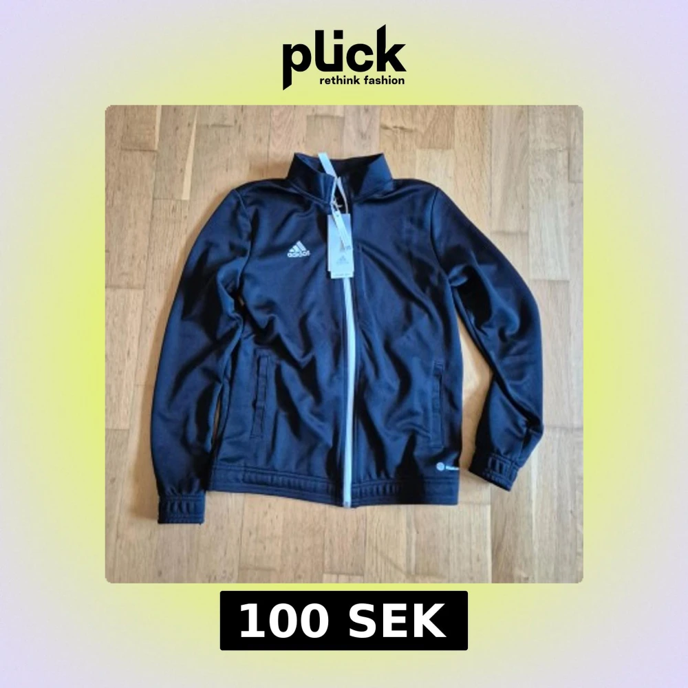 Säljer en svart tracktop från Adidas med dragkedja och två fickor framtill. Jackan har en stilren design med Adidas-logga på bröstet. Perfekt för träning eller en sportig look.