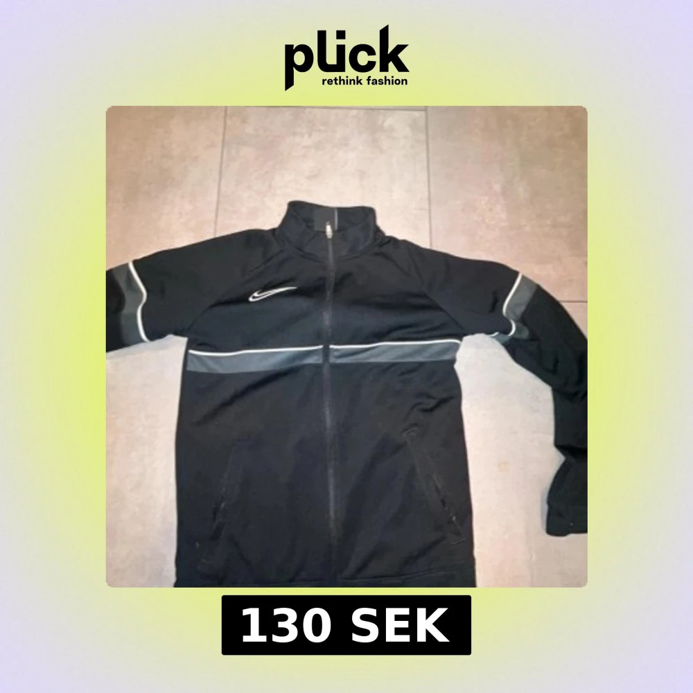 Svart träningsjacka från Nike med vit logga på bröstet och en vit rand över bröstet och ärmarna. Jackan har dragkedja framtill och ståkrage. Perfekt för sport eller chill.