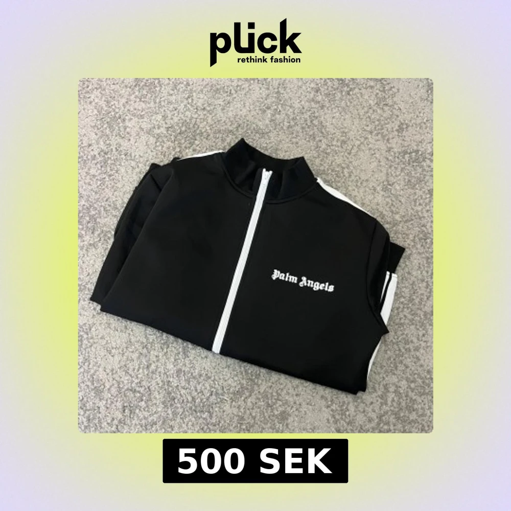 Snygg svart träningsjacka från Palm Angels med vita detaljer. Jackan har en dragkedja framtill och vita ränder längs ärmarna. Perfekt för en sportig look. (Ny pris 6400)
