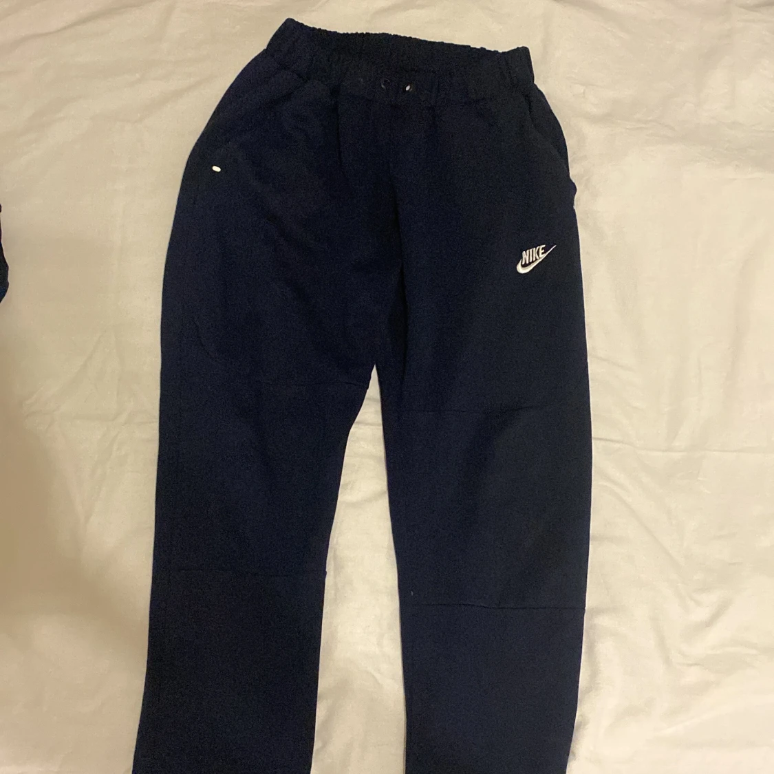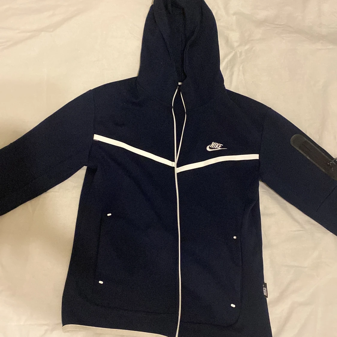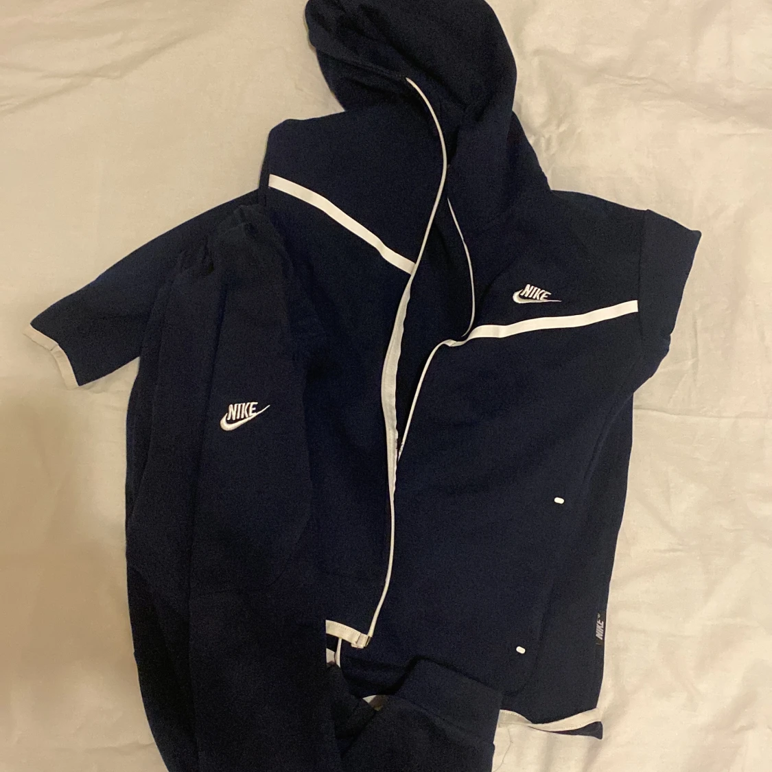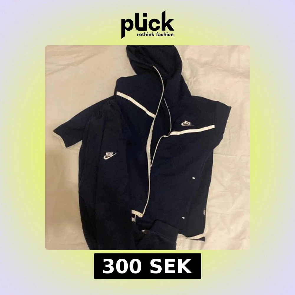 Snyggt svart träningsset från Nike med vit dragkedja och detaljer. Jackan har huva och långa ärmar, medan byxorna har elastisk midja för extra komfort. Perfekt för träning eller en avslappnad dag.