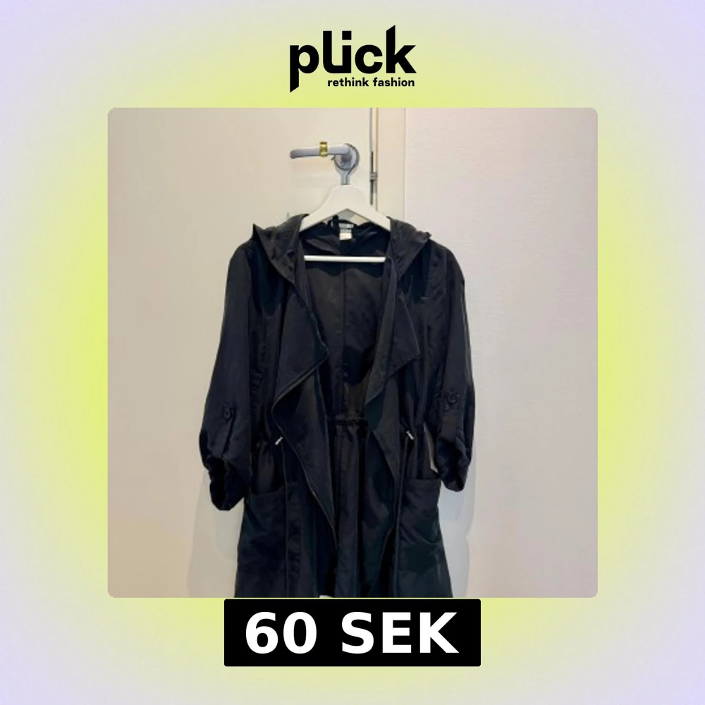 Snygg svart trenchcoat med huva och dragkedja framtill. Jackan har långa ärmar och praktiska fickor. Perfekt för till våren. Storlek M, från H&M.