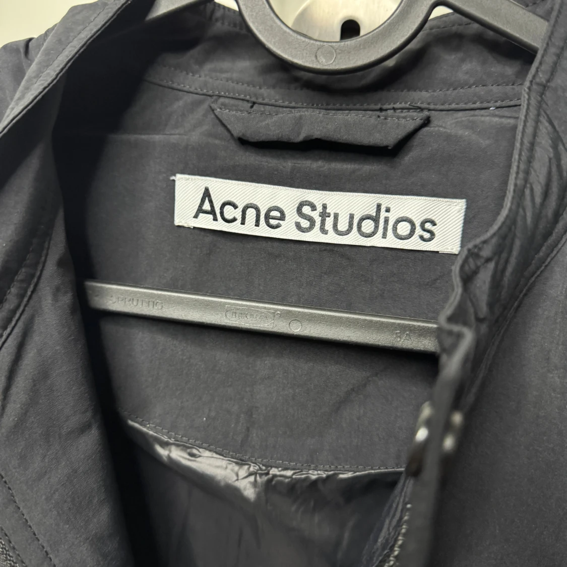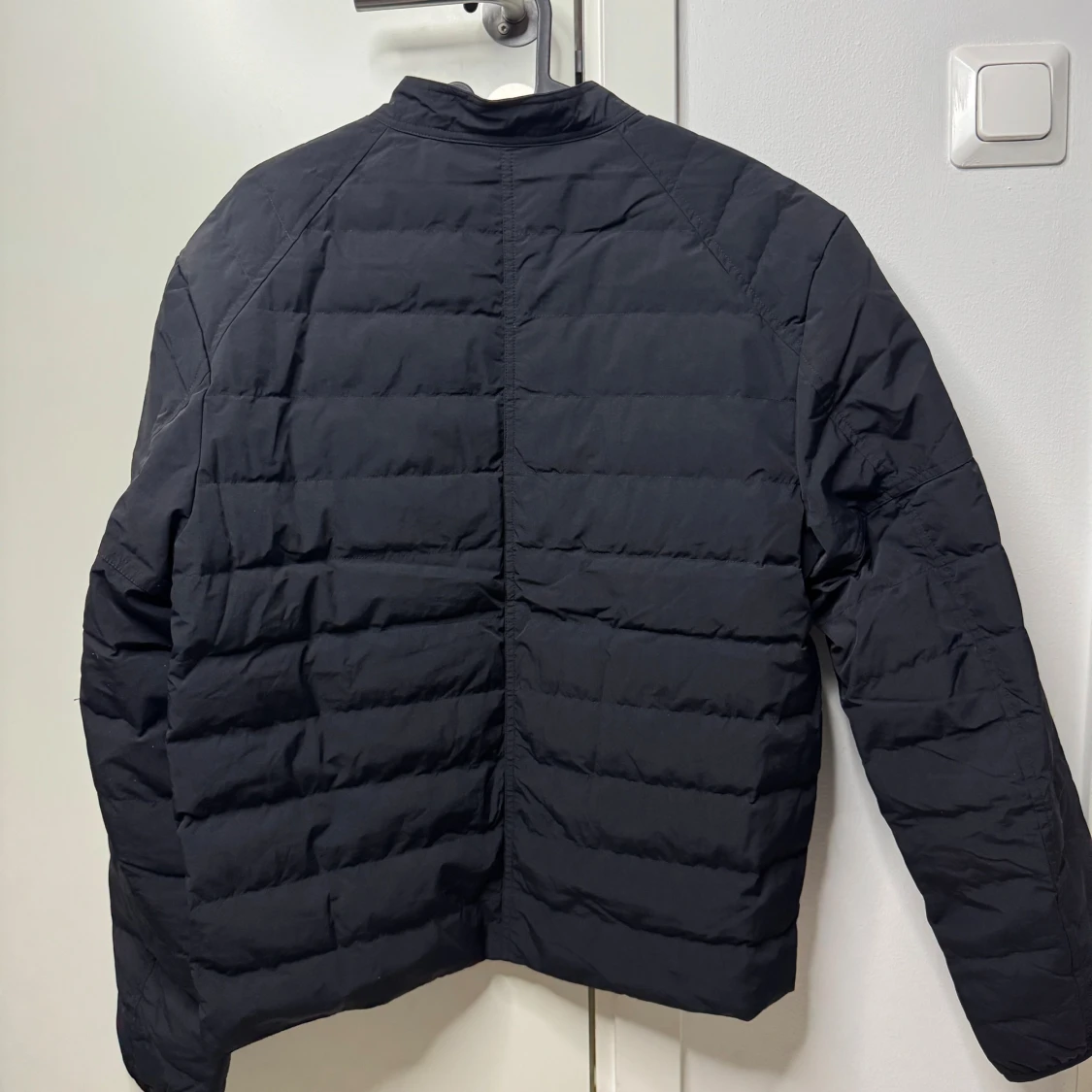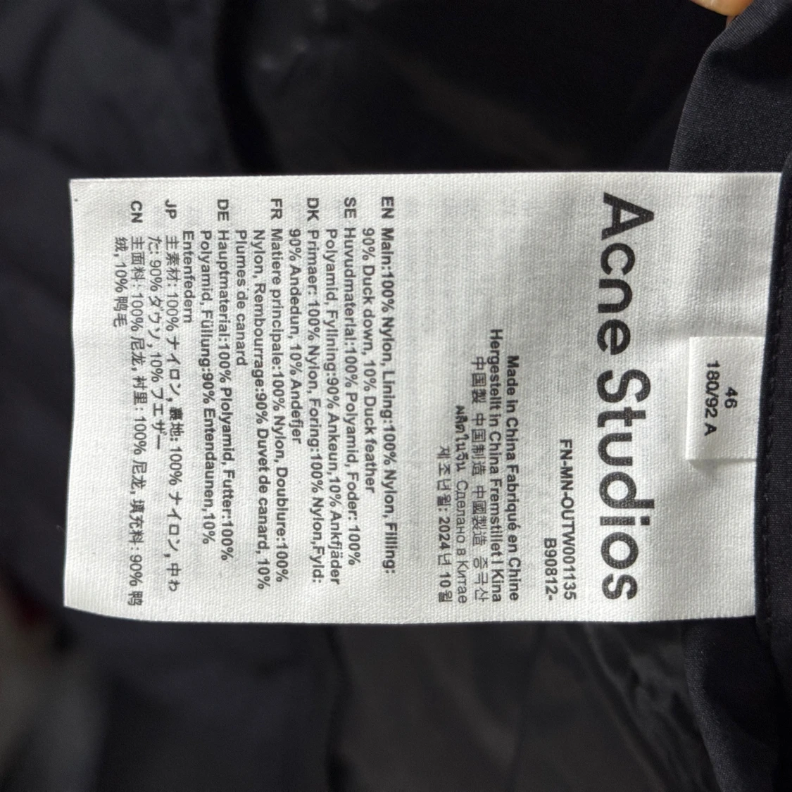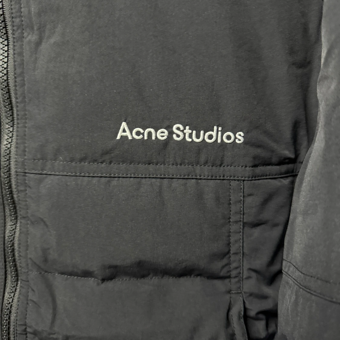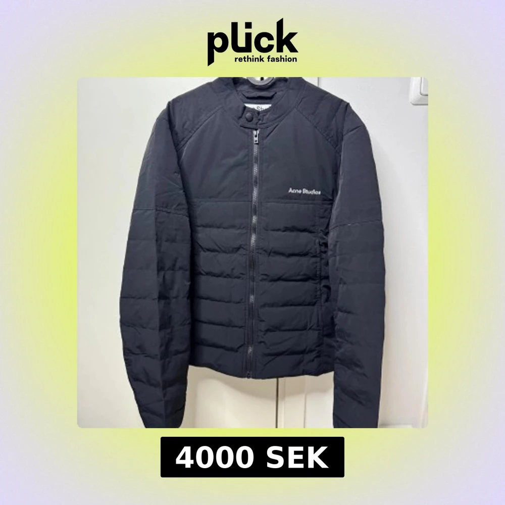 Svart dunjacka från Acne Studios med minimalistisk design och diskret logga på bröstet. Jackan har quiltad struktur, rak passform och dragkedja framtill. Yttermaterialet är nylon och fodret består av 90% dun och 10% fjäder. Perfekt för kyliga dagar. Storlek 46