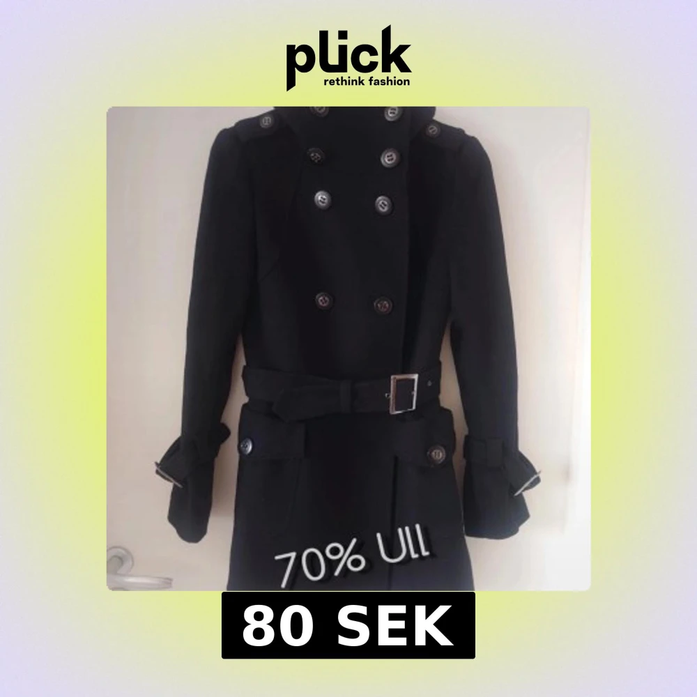 Snygg svart kappa i 70% ull med dubbelknäppning, bred krage och bälte i midjan. Jackan har långa ärmar med spänndetaljer och stora knappar framtill och på fickorna. Perfekt för dig som gillar klassisk stil med en modern twist.