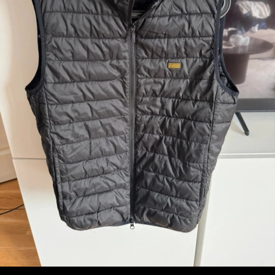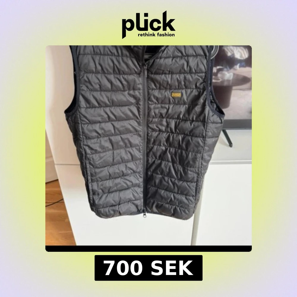 Säljer en svart quiltad dunväst från Barbour International. Västen har en stilren look medp, dragkedja framtill och en liten gul Barbour-logga på bröstet.