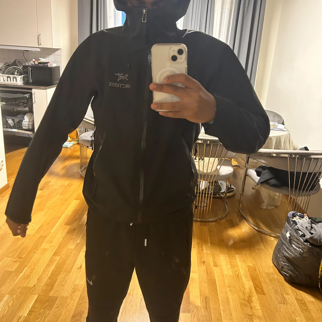 Säljer en svart vindjacka från Arc'teryx i storlek S. Jackan har en stilren design med dragkedja och justerbar huva. Perfekt för blåsiga dagar och utomhusaktiviteter. Den är i mycket bra skick och redo för nya äventyr!