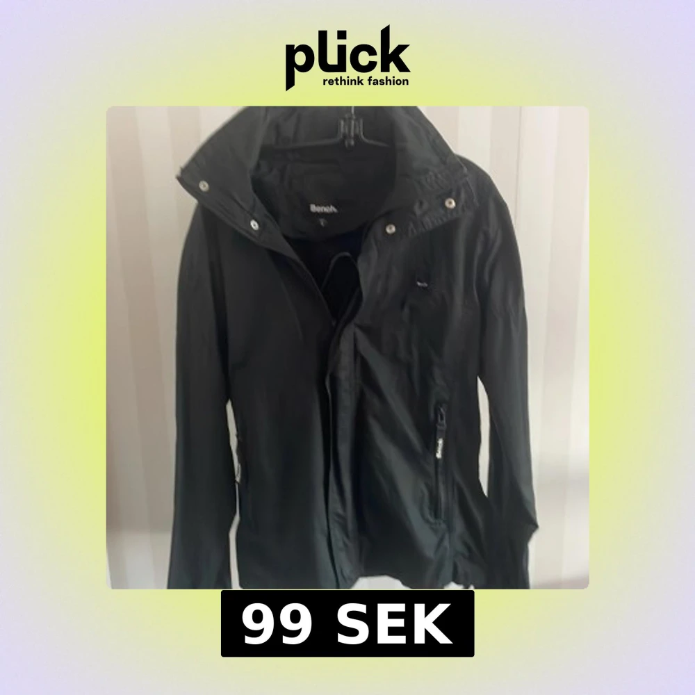 Snygg svart vindjacka från Bench med dragkedja och hög krage. Jackan har långa ärmar och Bench-logga på kragen. Perfekt för blåsiga dagar.