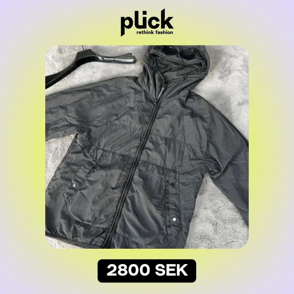 Säljer en svart vindjacka från C.P. Company med huva och inbyggda glasögon. Jackan har dragkedja framtill och praktiska fickor med knappar. Perfekt för blåsiga dagar och har en cool, unik stil.