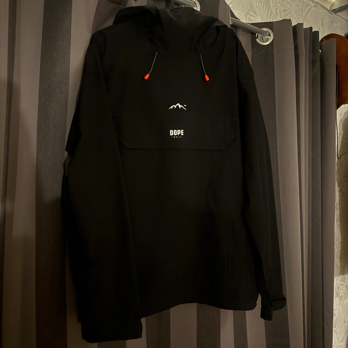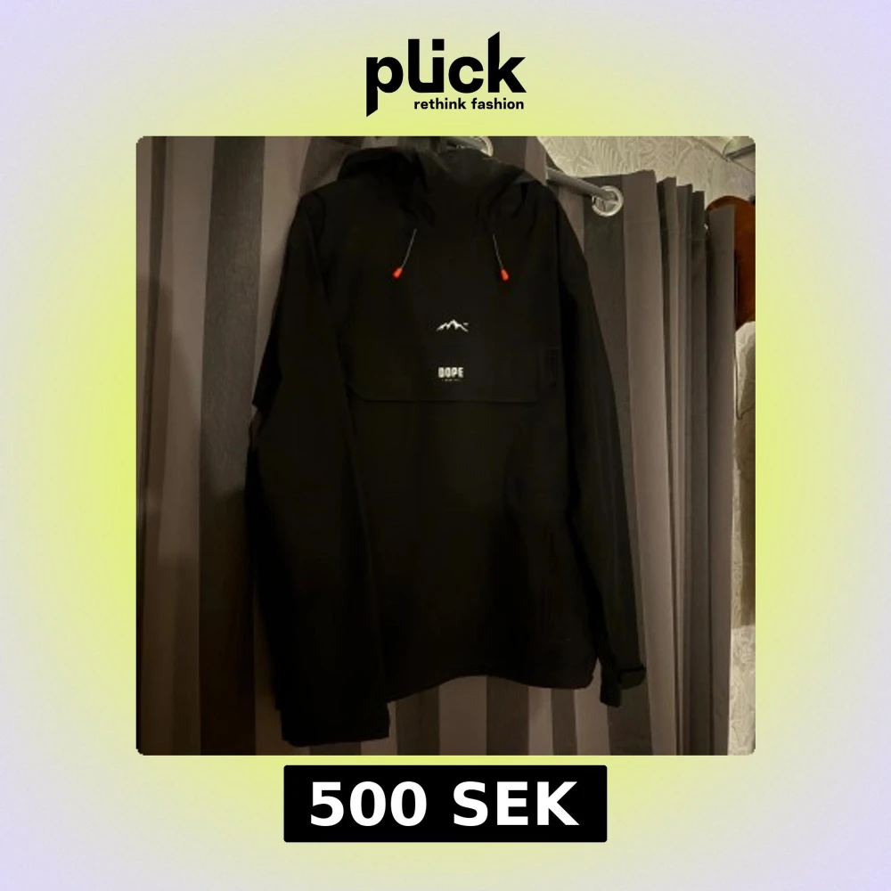 Svart vindjacka från Dope med huva och dragsko med röda detaljer. Stor ficka framtill med Dope-logga. Perfekt för dig som gillar streetwear och vill ha en stilren jacka med snygga detaljer. Endast använd fåtal gånger💞Säljer även 2 till dope jackor. Storlek M