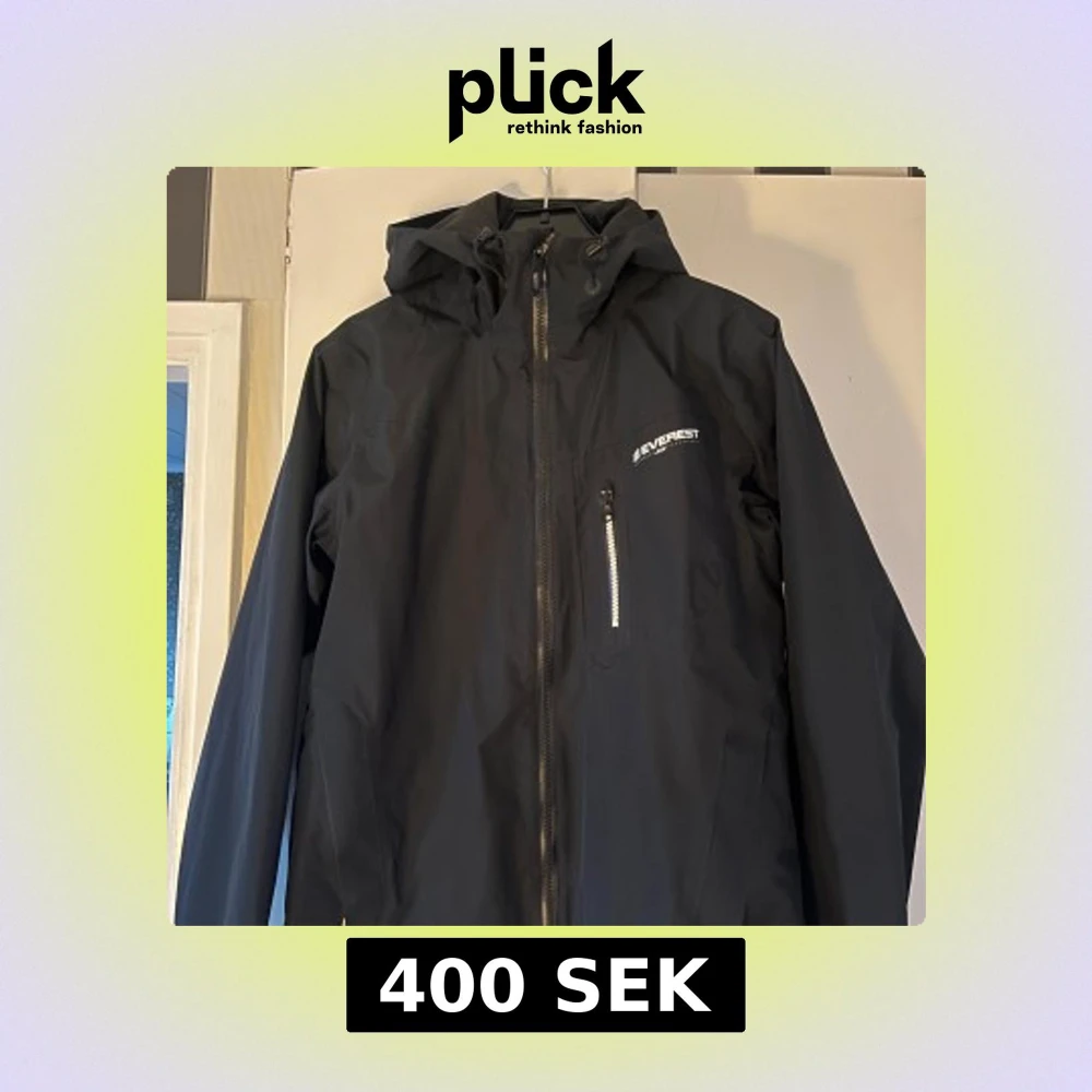 Säljer en svart vindjacka från Everest med huva och dragkedja. Jackan har en praktisk bröstficka med dragkedja och är perfekt för blåsiga dagar. Den är designad för att hålla dig skyddad mot väder och vind.