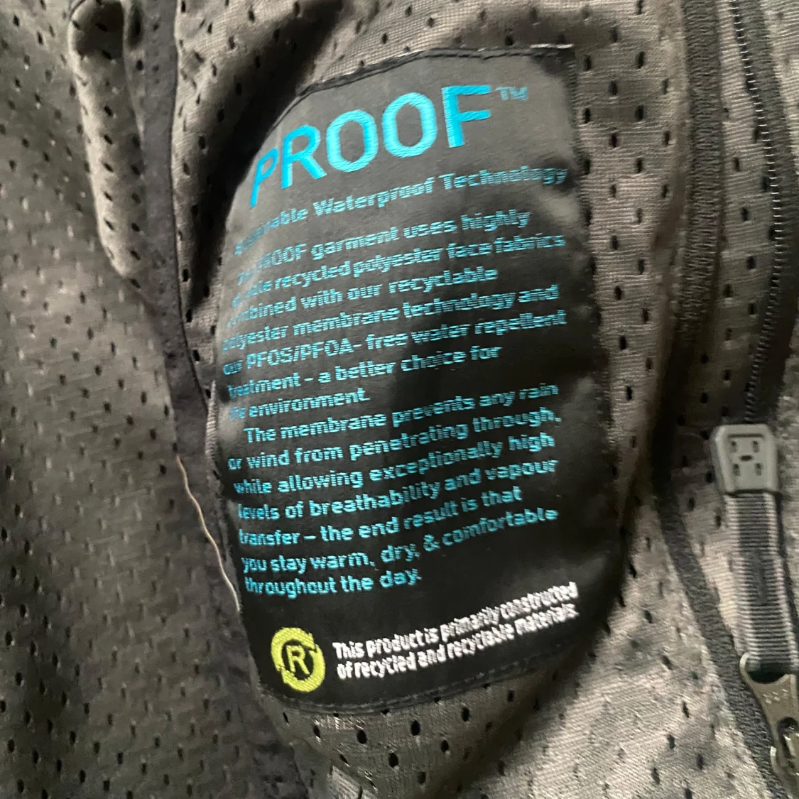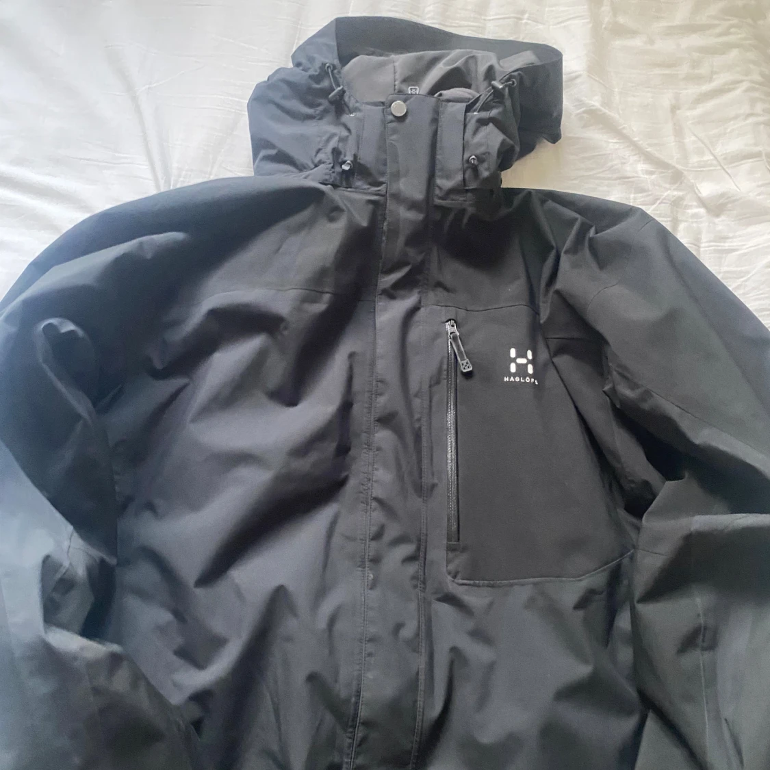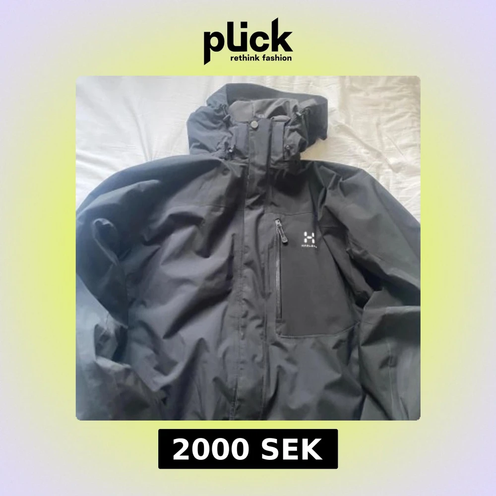 Svart vindjacka från Haglöfs i storlek XL. Jackan har huva, dragkedja framtill och en bröstficka med dragkedja. Tillverkad i återvunnen polyester med vattentät PROOF-membran. Perfekt för blåsiga och regniga dagar.