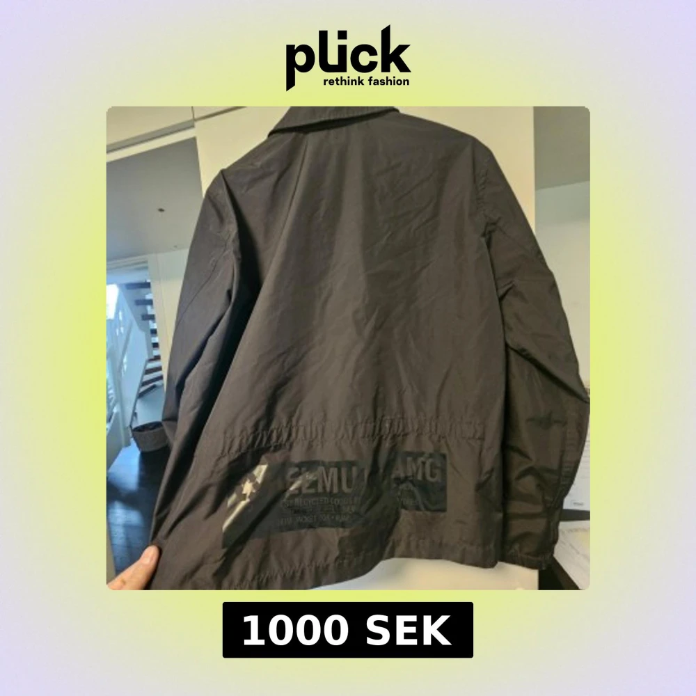 Svart vindjacka från Helmut Lang med klassisk krage och tryckknappar framtill. Jackan har diskret logga på bröstet och detaljerad text på ryggen. Tillverkad i 100% återvunnen polyester från havsplast, vilket gör den både snygg och miljövänlig. Nypris +4000:-