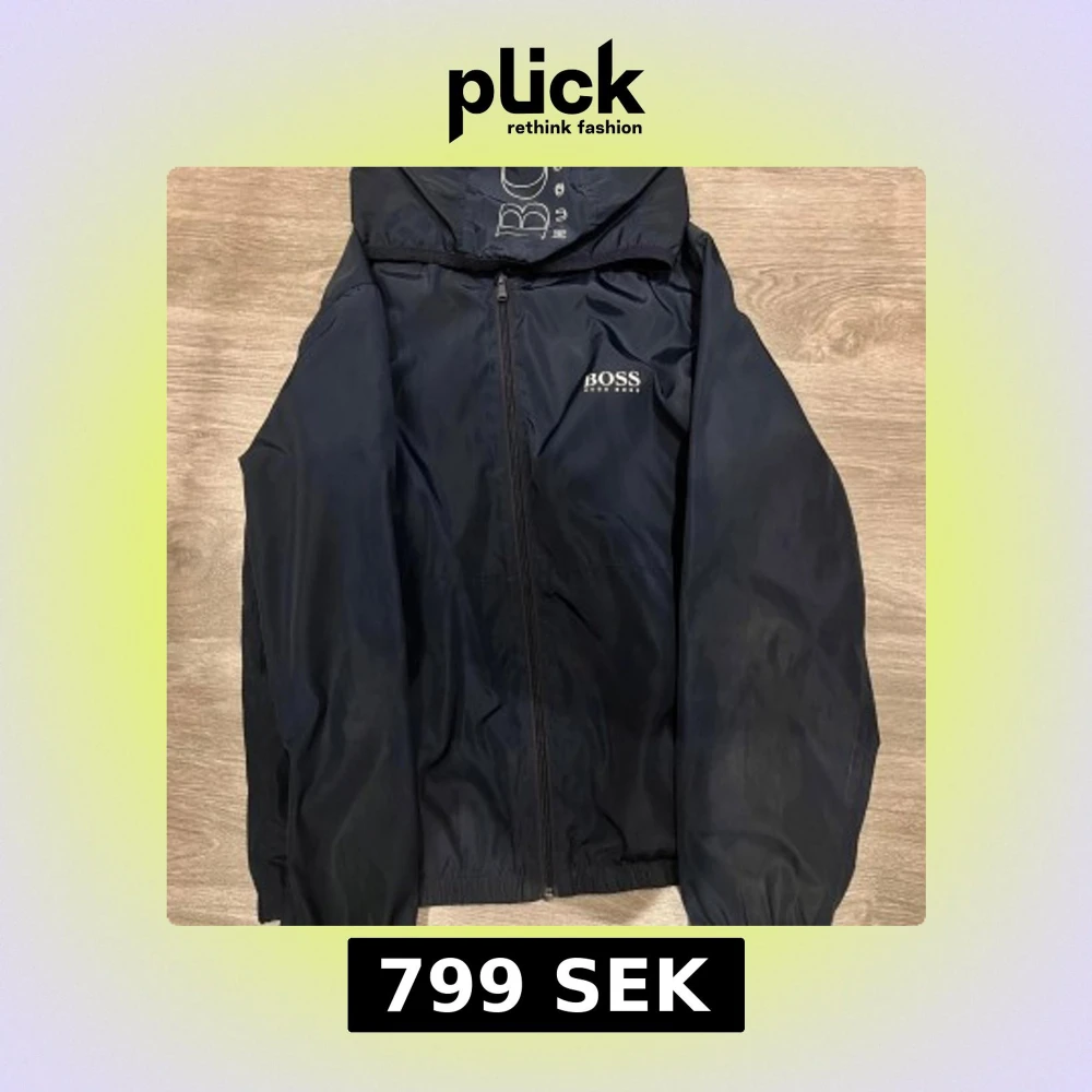 Snygg svart vindjacka från Hugo Boss med dragkedja och huva. Jackan har ett stilrent utseende med märkets logga på bröstet. Perfekt för blåsiga dagar.