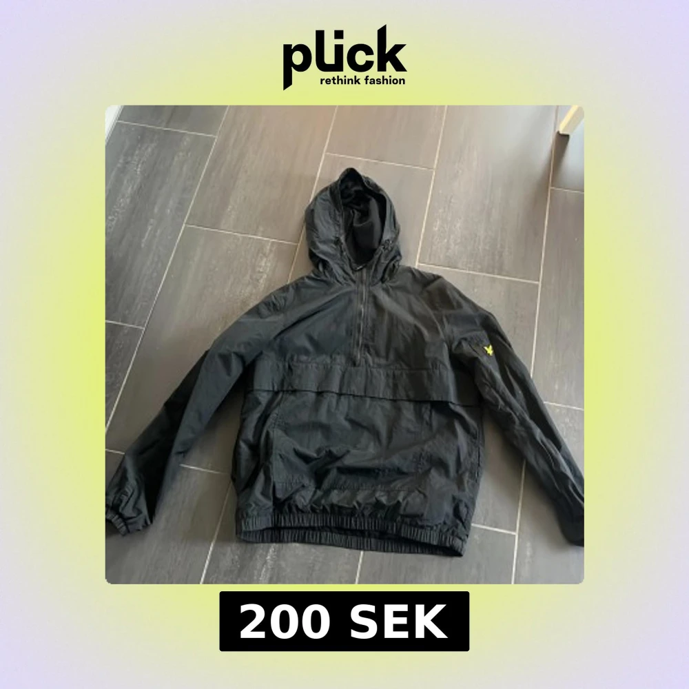 Svart vindjacka från Lyle & Scott med huva och halv dragkedja. Jackan har elastiska muddar, stor ficka framtill och den klassiska gula loggan på ärmen. Tillverkad i lätt polyester, perfekt för blåsiga dagar. Ficka på ärmen också. Köpt för 799