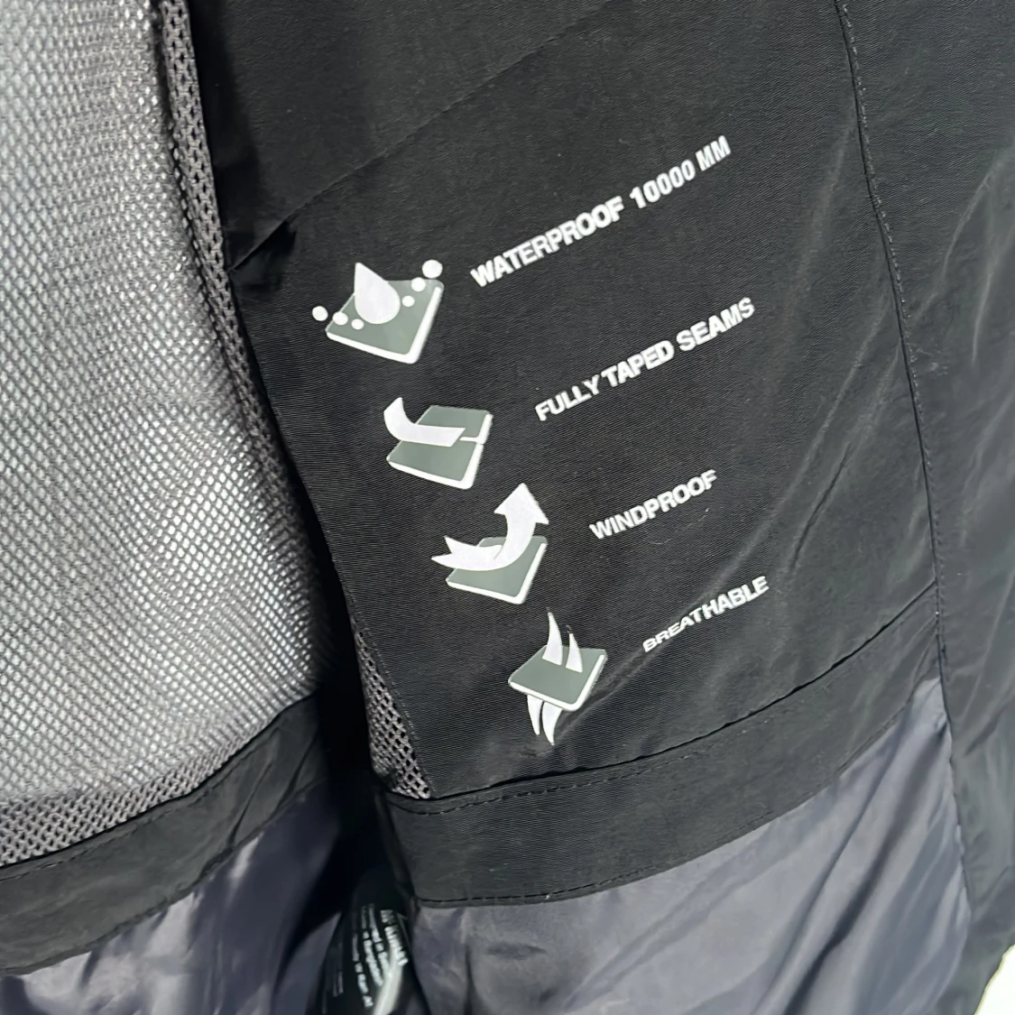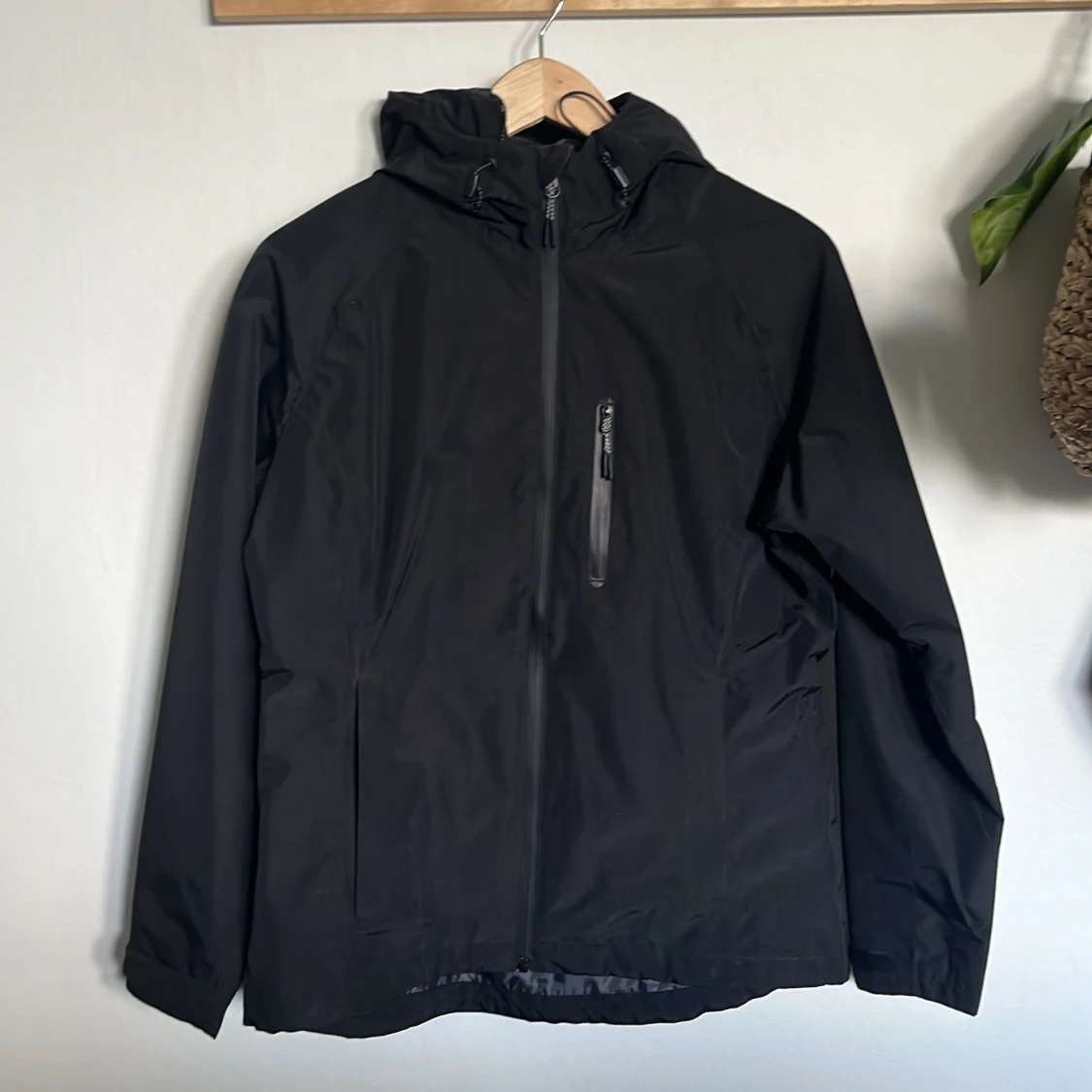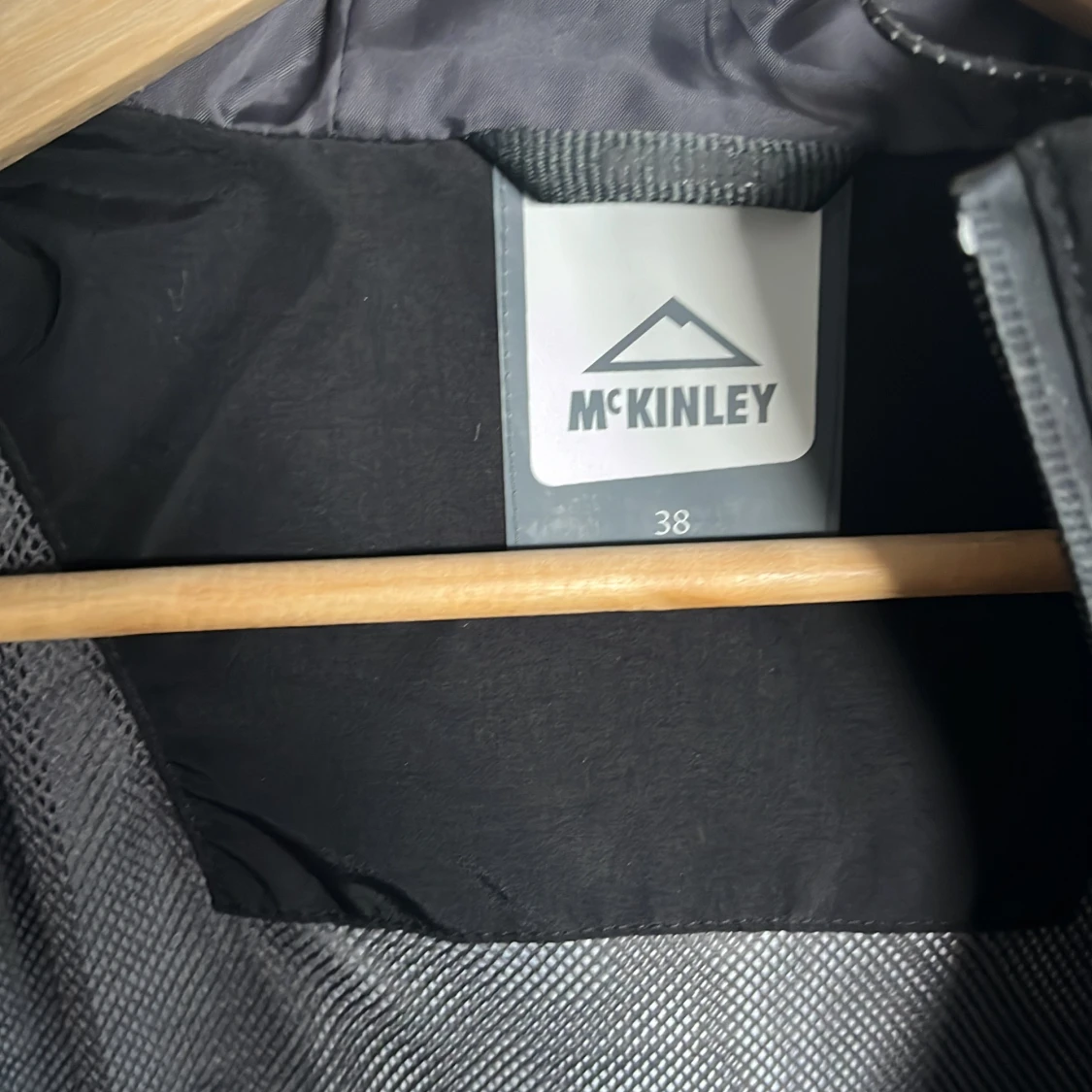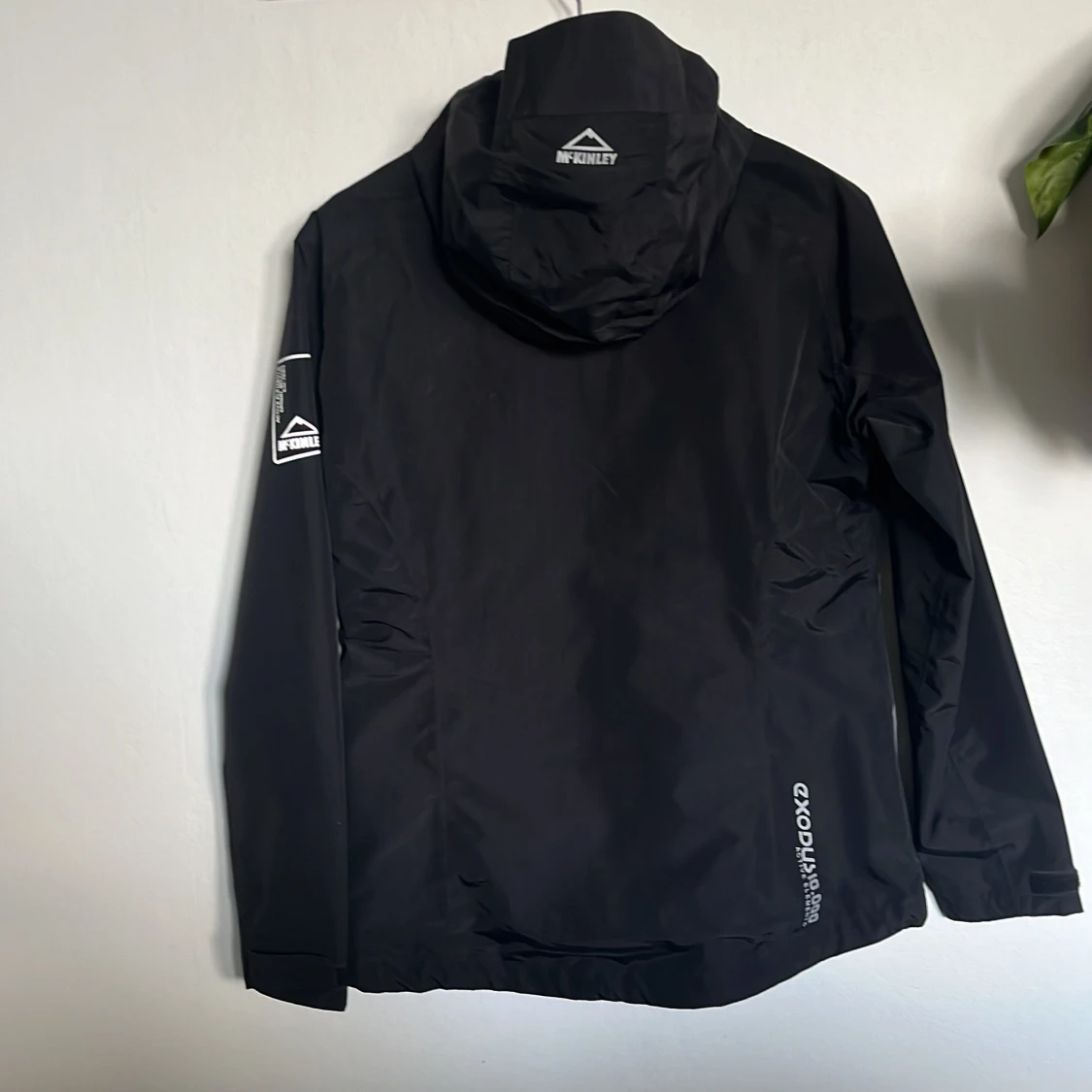 Säljer en svart vindjacka från McKinley i storlek 38. Jackan är perfekt för utomhusaktiviteter med sin vattentäta design (10,000 mm) och helt tejpade sömmar. Den är både vindtät och andas bra, vilket gör den idealisk för blåsiga och regniga dagar. Jackan har en dragkedja framtill och en praktisk huva.