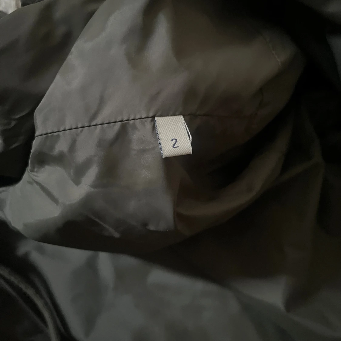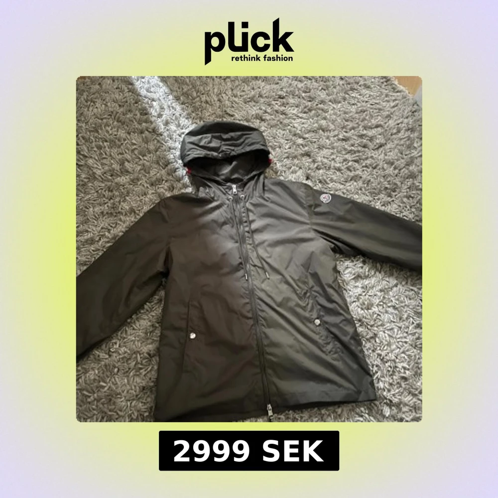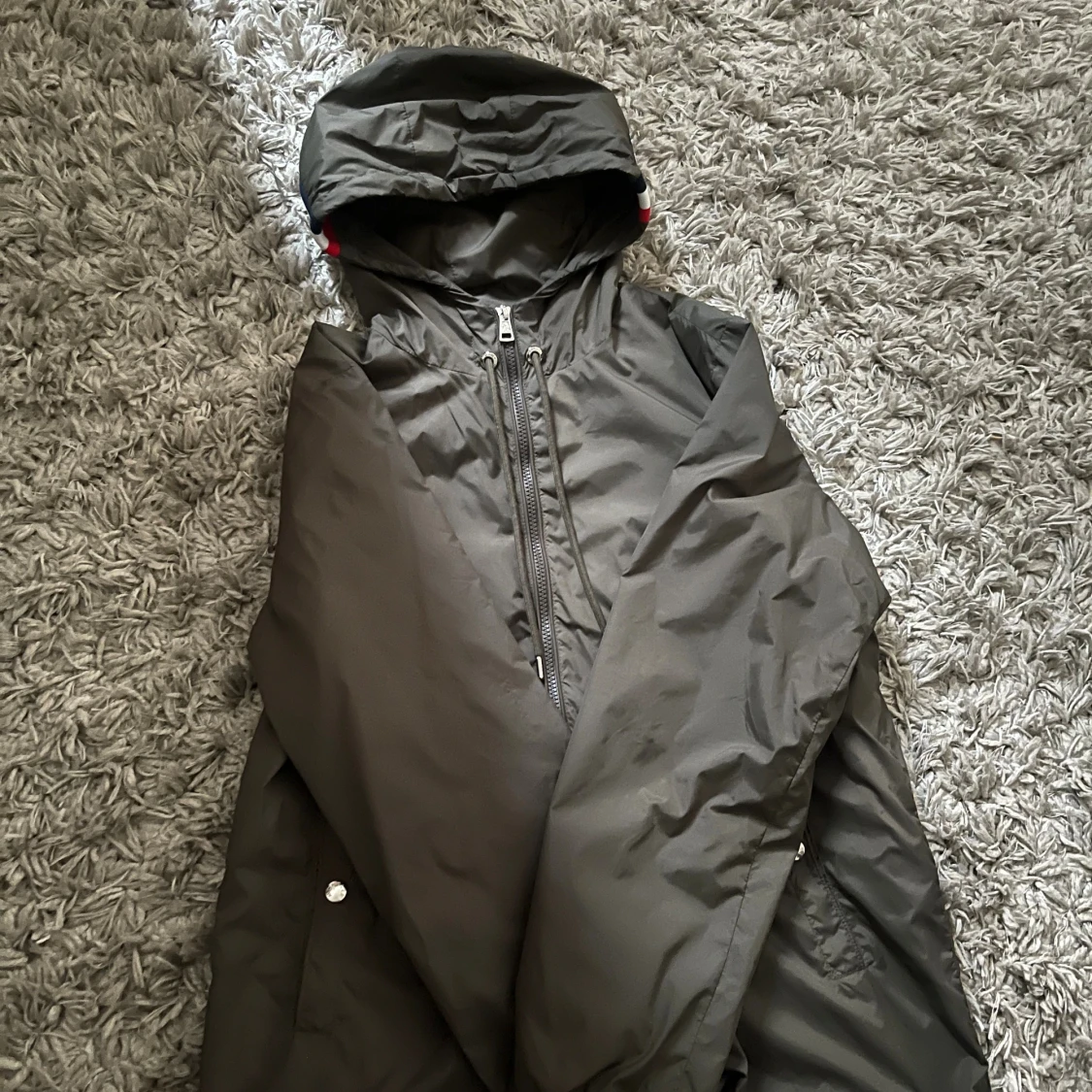 Säljer en svart vindjacka från Moncler med huva och dragkedja framtill. Jackan har två fickor med knappar och en klassisk Moncler-logga på ärmen. Perfekt för blåsiga dagar och enkel att matcha med allt. Materialet är lätt och känns sportigt.