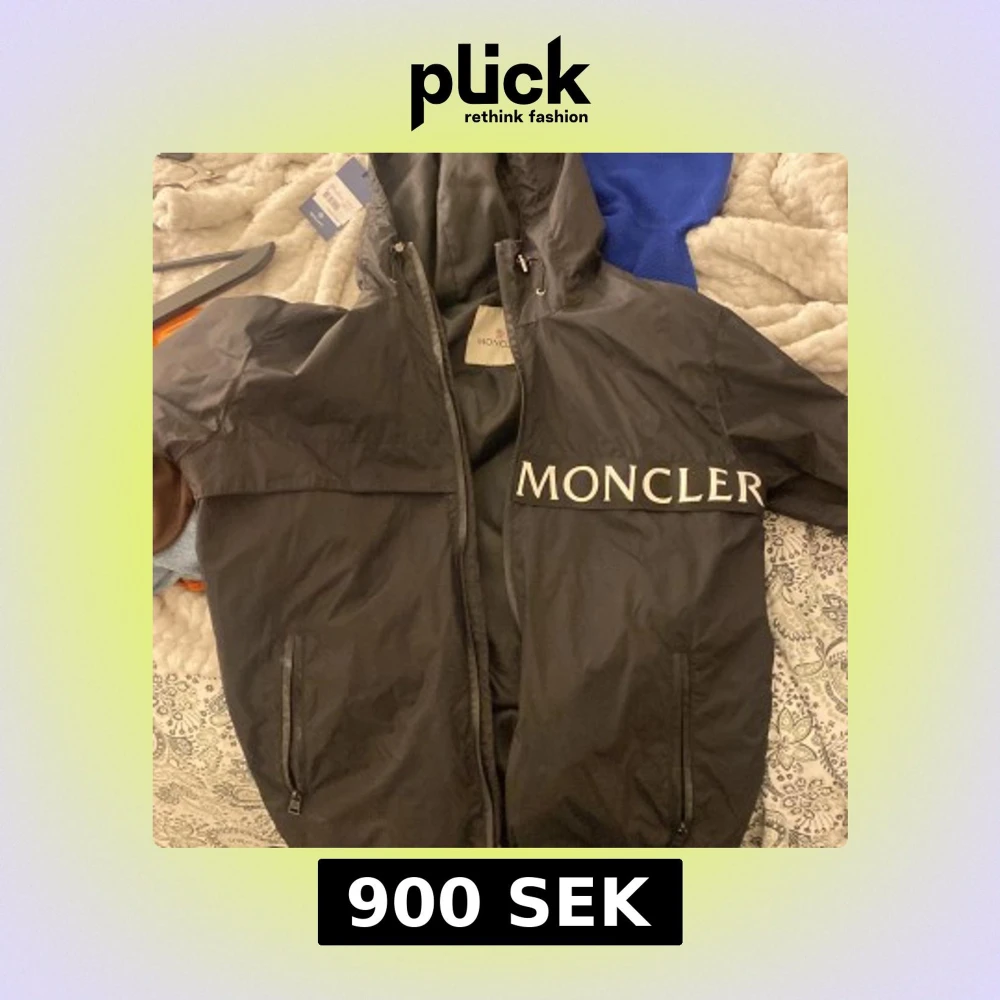 Säljer en svart vindjacka från Moncler med stor logotyp på bröstet och ärmen. Jackan har huva, dragkedja framtill och två fickor med dragkedja. Perfekt för dig som vill ha en stilren och exklusiv jacka.