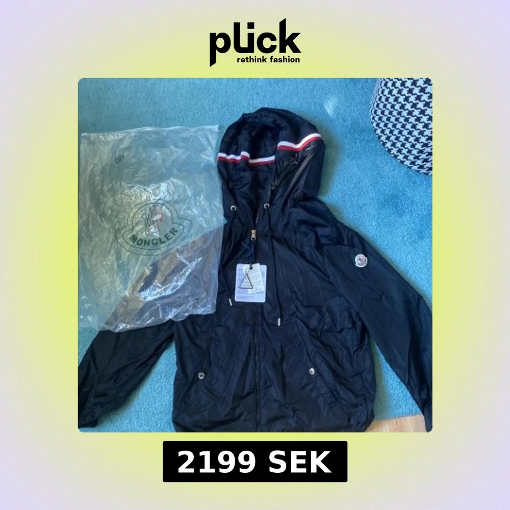 Svart vindjacka från Moncler med huva och dragsko, dekorerad med röd och vit rand på huvan. Jackan har dragkedja framtill, två fickor med tryckknappar och Moncler-logga på ärmen. Perfekt för blåsiga dagar och snygg streetstil.