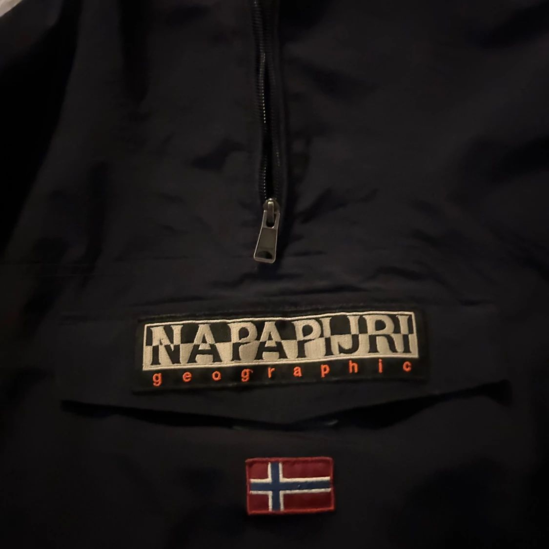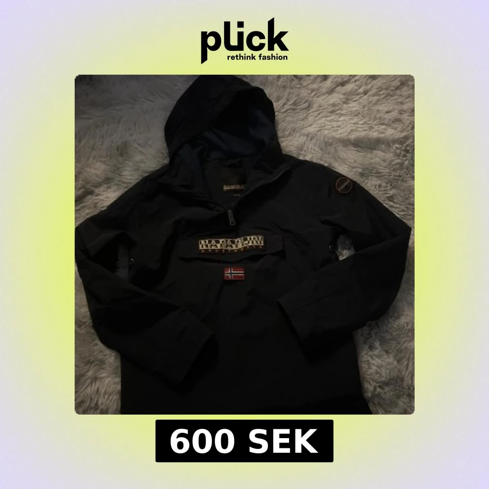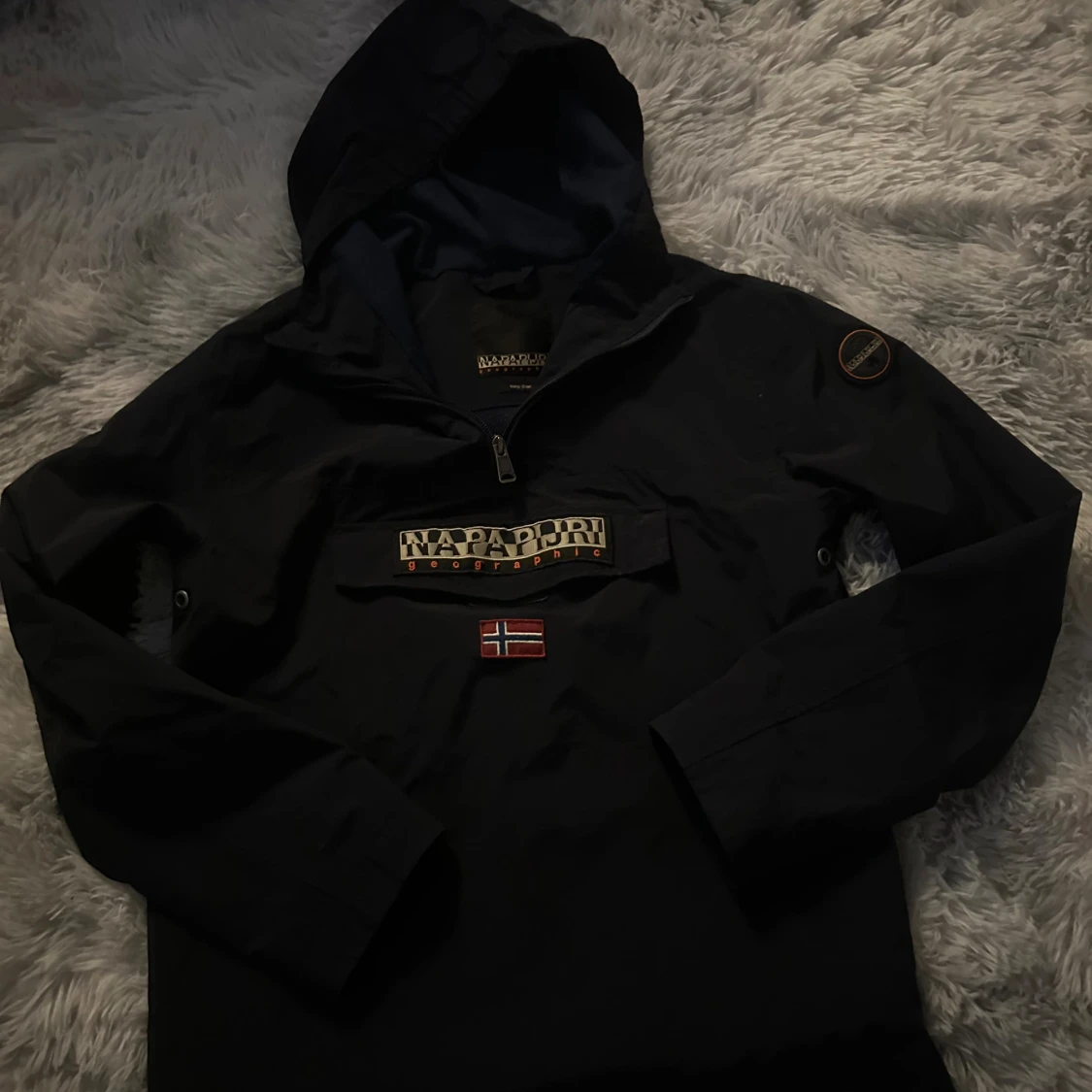 Svart vindjacka från Napapijri med huva och halv dragkedja. Väldigt fint skick och är i storlek xs. Ny pris:1400kr