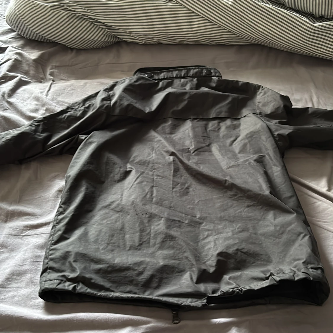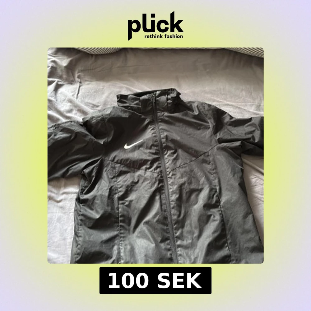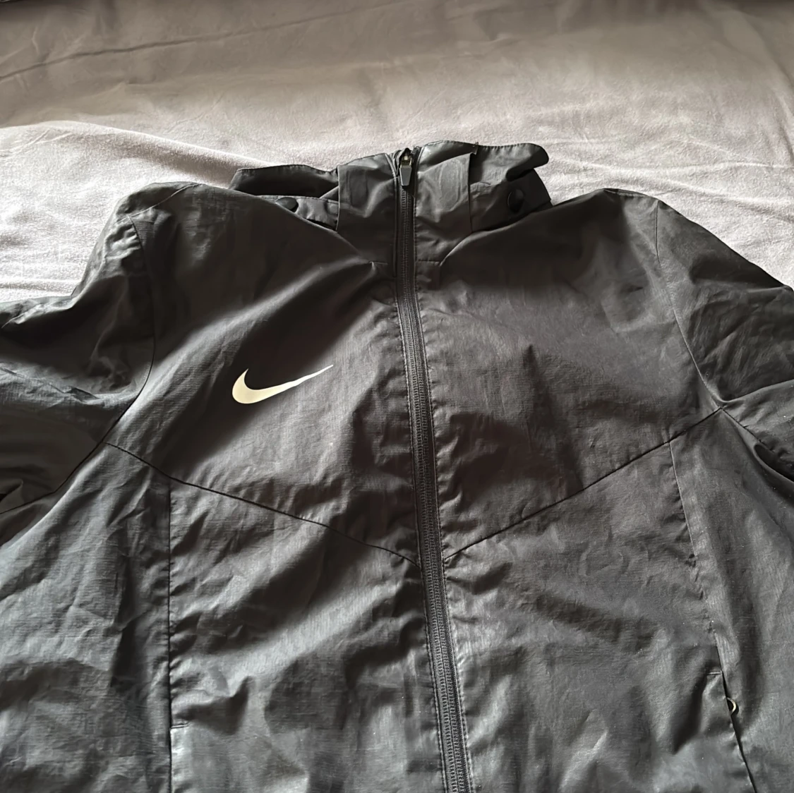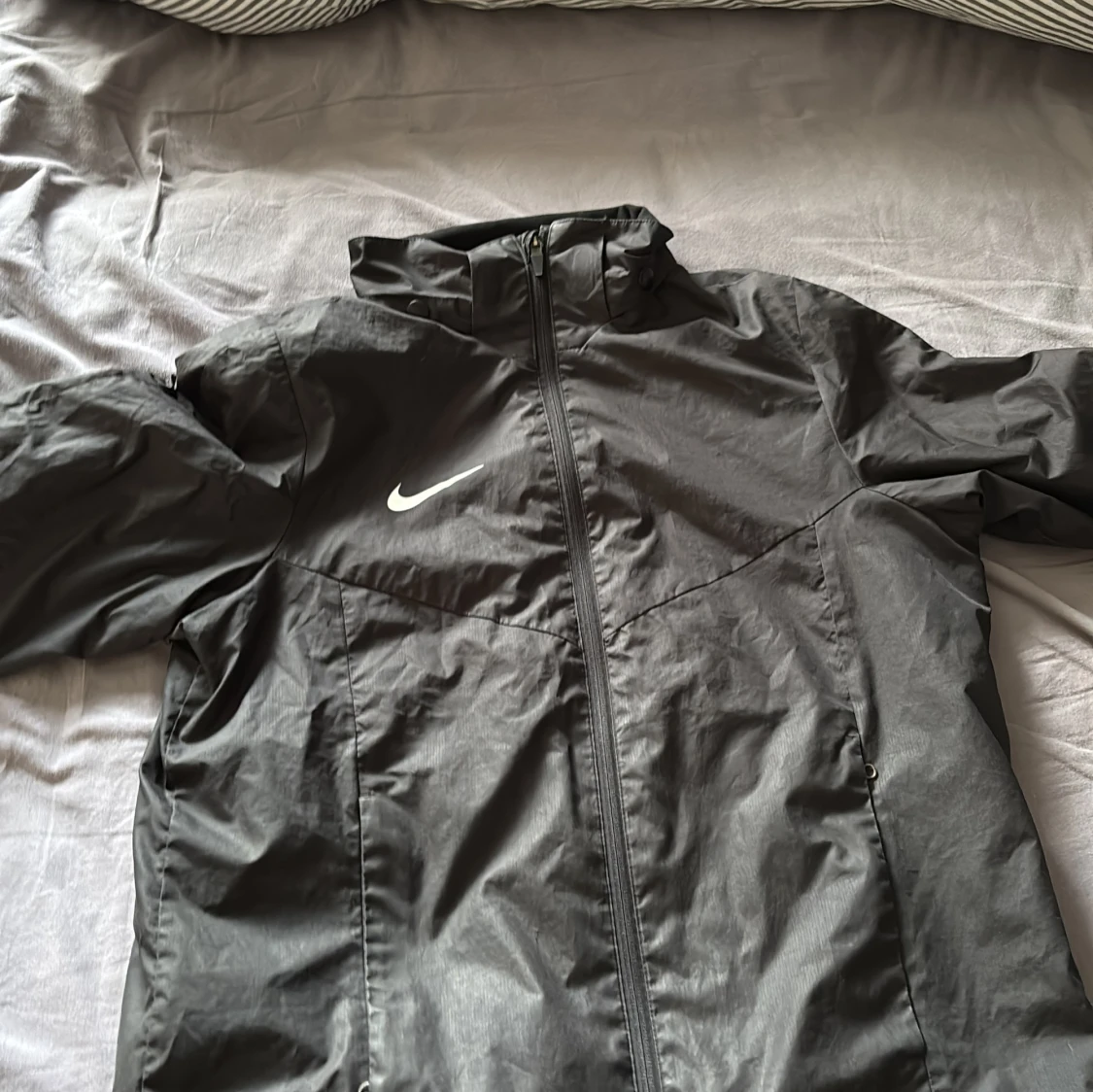 Säljer en svart vindjacka från Nike med dragkedja framtill och hög krage. Jackan har en enkel och sportig design med Nike-logga på bröstet. Perfekt för utomhusaktiviteter när det blåser.