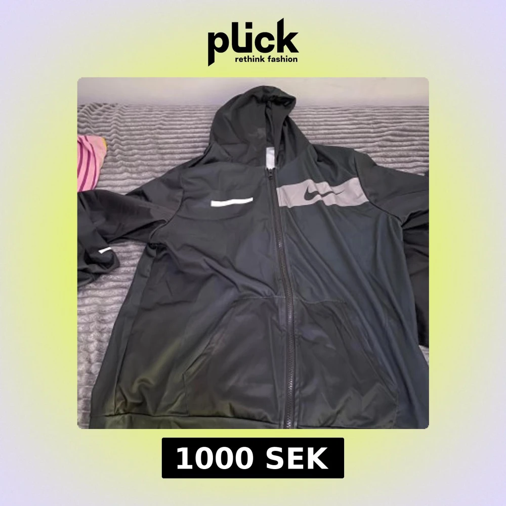 Säljer en svart vindjacka från Nike med huva och hel dragkedja. Jackan har en grå panel med Nike-logga på bröstet och praktiska fickor framtill. Insidan är ljusgrå och materialet känns lätt och smidigt, perfekt för blåsiga dagar.