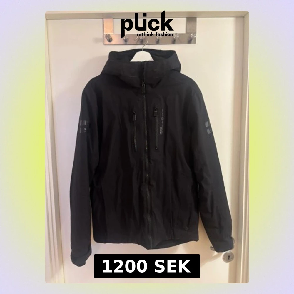 Svart vindjacka från sail racing med huva och flera dragkedjeförsedda fickor framtill. Strl M. Priset kan diskuteras vid snabb affär, inga skambud. Inga byten.