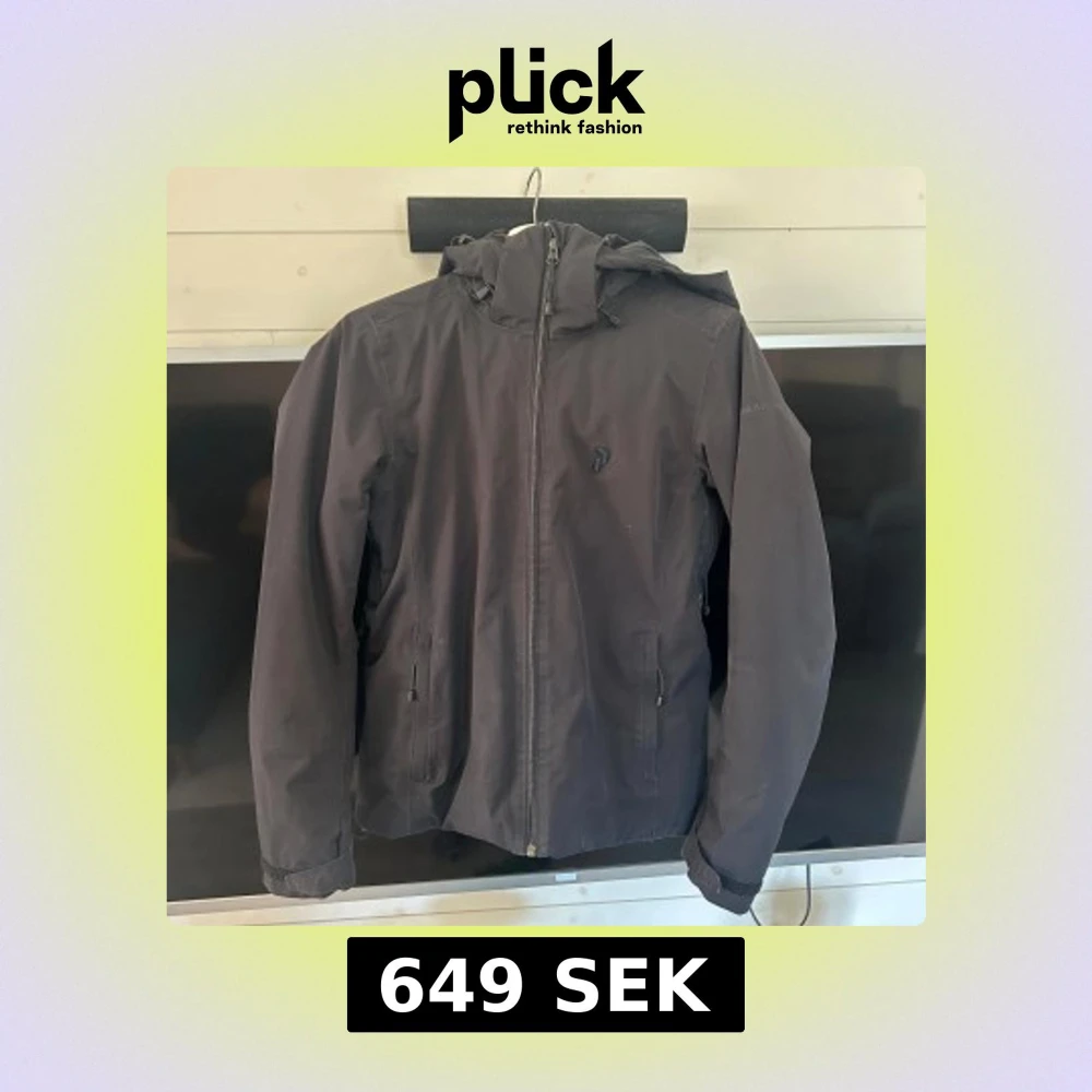 Svart vindjacka med huva och dragkedja framtill. Jackan har två fickor med dragkedja och en diskret logotyp på bröstet. Perfekt för blåsiga dagar och enkel att matcha med det mesta.