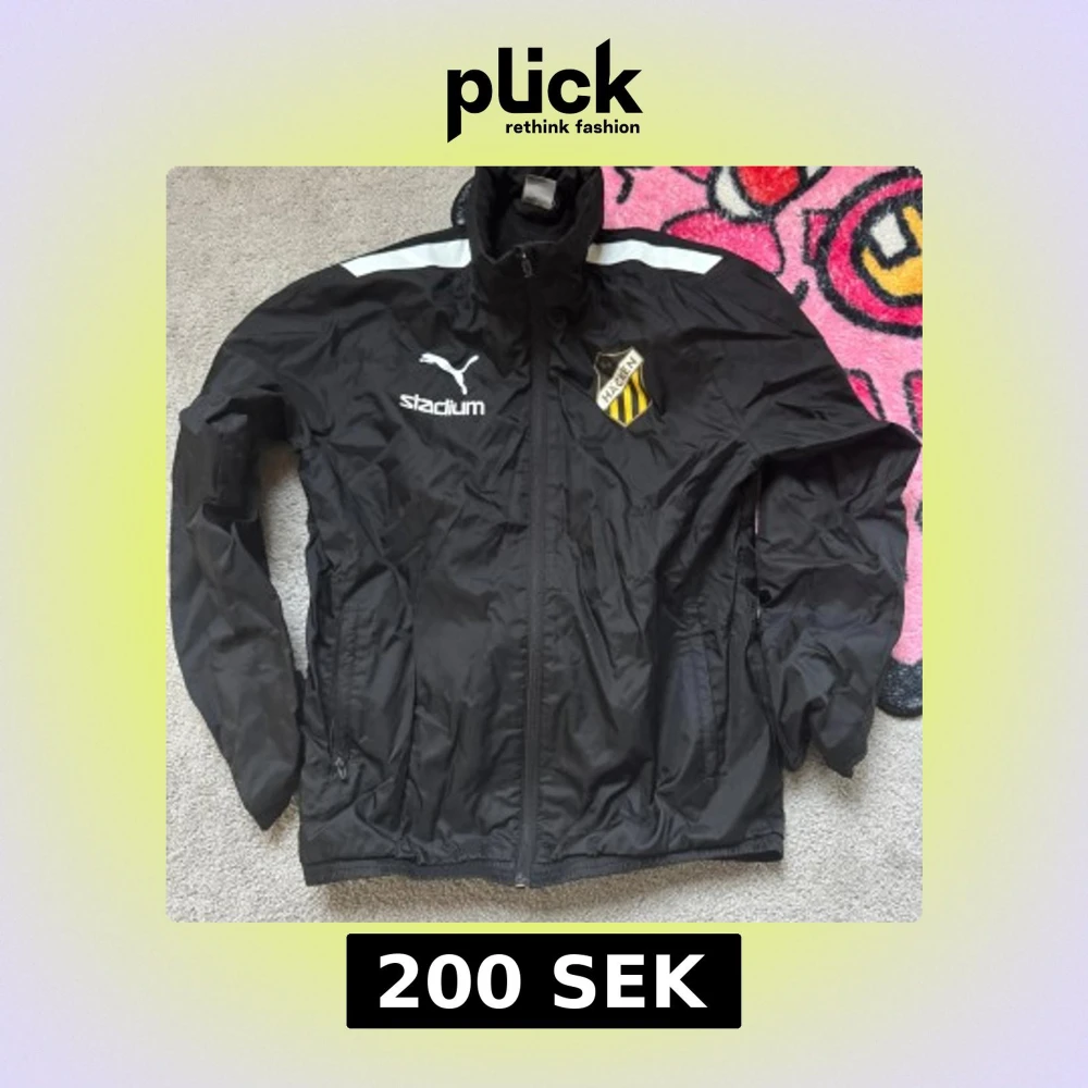 Svart vindjacka från Puma med BK Häcken-logga på bröstet och vita detaljer på axlarna. Jackan har dragkedja framtill och två sidofickor. Perfekt för fotbollsträning eller som supporterjacka.