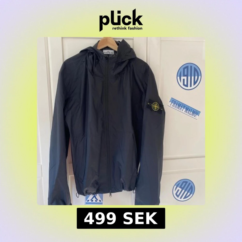 Säljer en svart vindjacka från Stone Island med huva och dragkedja framtill. Jackan har den klassiska loggan på vänster ärm och är tillverkad i borstad bomull med vattenavvisande finish.Jackan sitter som en stor M men lutar lite mer åt L hållet. men Perfekt för dig som gillar stilrena och funktionella plagg.