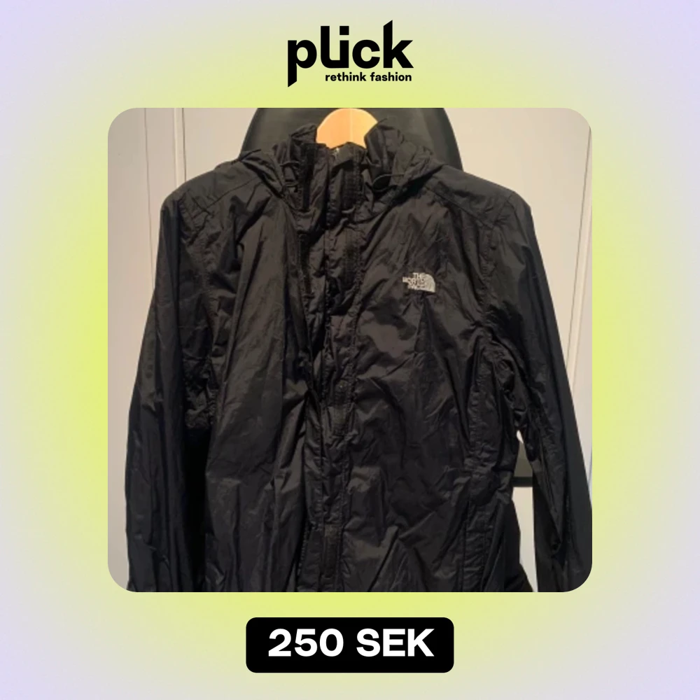 Säljer en svart vindjacka från The North Face. Den är perfekt för blåsiga dagar och har en praktisk huva. Jackan har en dragkedja framtill och är i ett lätt och smidigt material. Den är i bra skick och redo för nya äventyr!